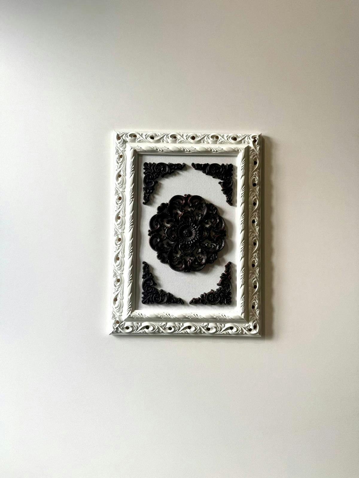 Quadro con cornice stile barocco colore bianco lucido, quadro realizzato artigianalmente con intaglio sul legno colore noce scuro e base bianca.