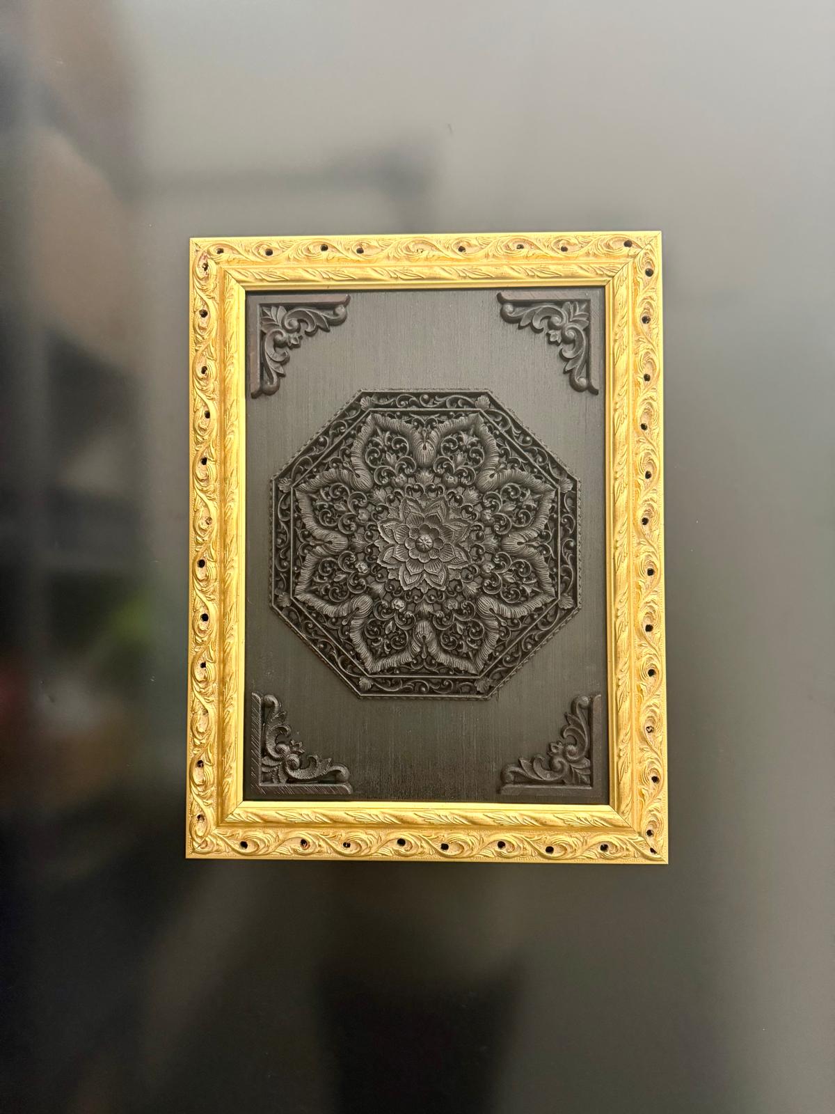 L'intaglio è un intreccio finissimo di motivi floreali e arabeschi che sembrano sbocciare da un cuore centrale, creando un mandala di rara complessità.