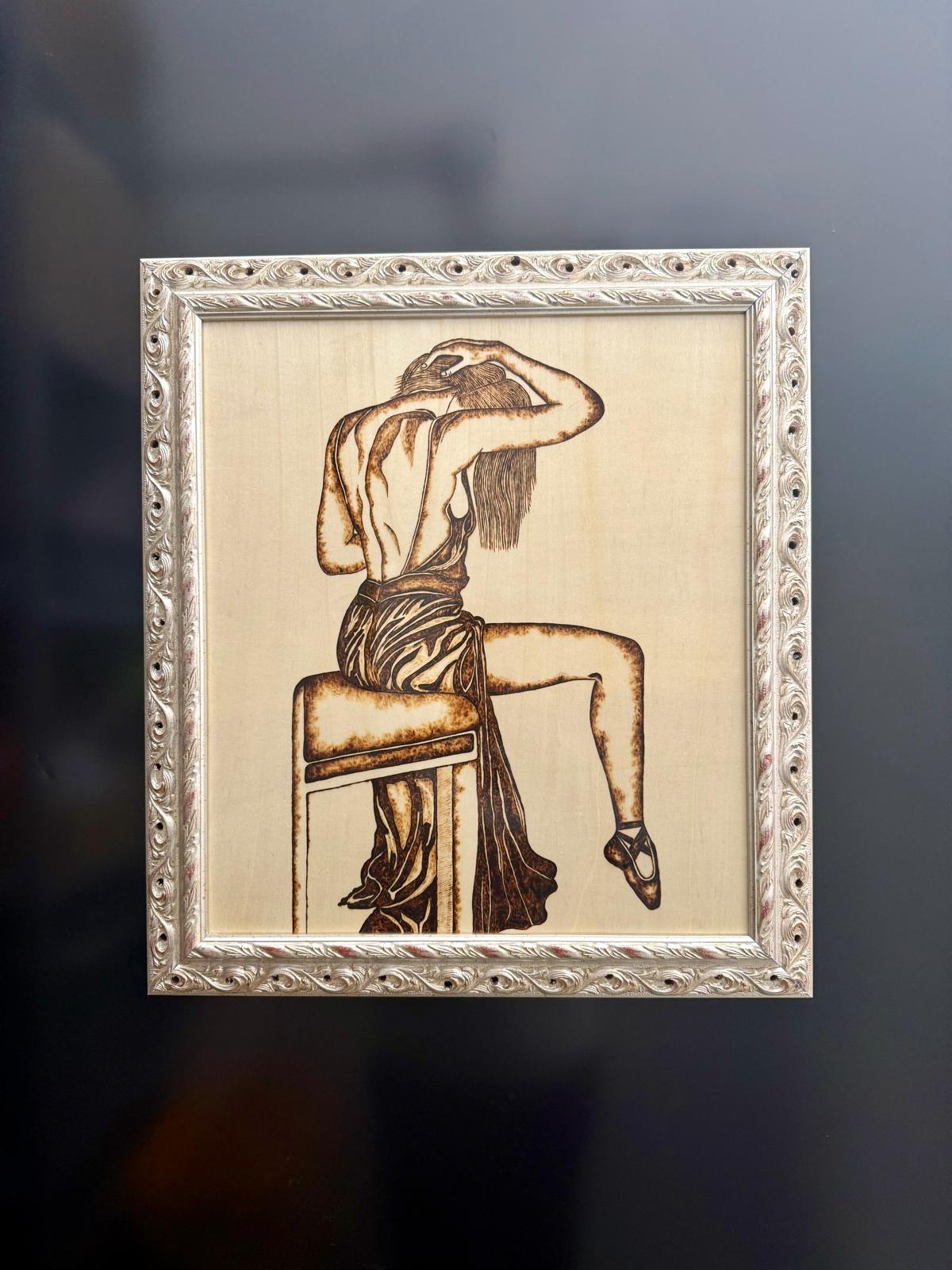 Questa opera cattura la grazia silenziosa e la forza disciplinata della danza, fissandole per sempre sulla materia viva attraverso l'antica tecnica della pirografia. Interamente inciso a mano bruciando la superficie del legno, questo quadro non è solo un ritratto, ma un tributo all'eleganza del corpo umano e alla dedizione artistica.