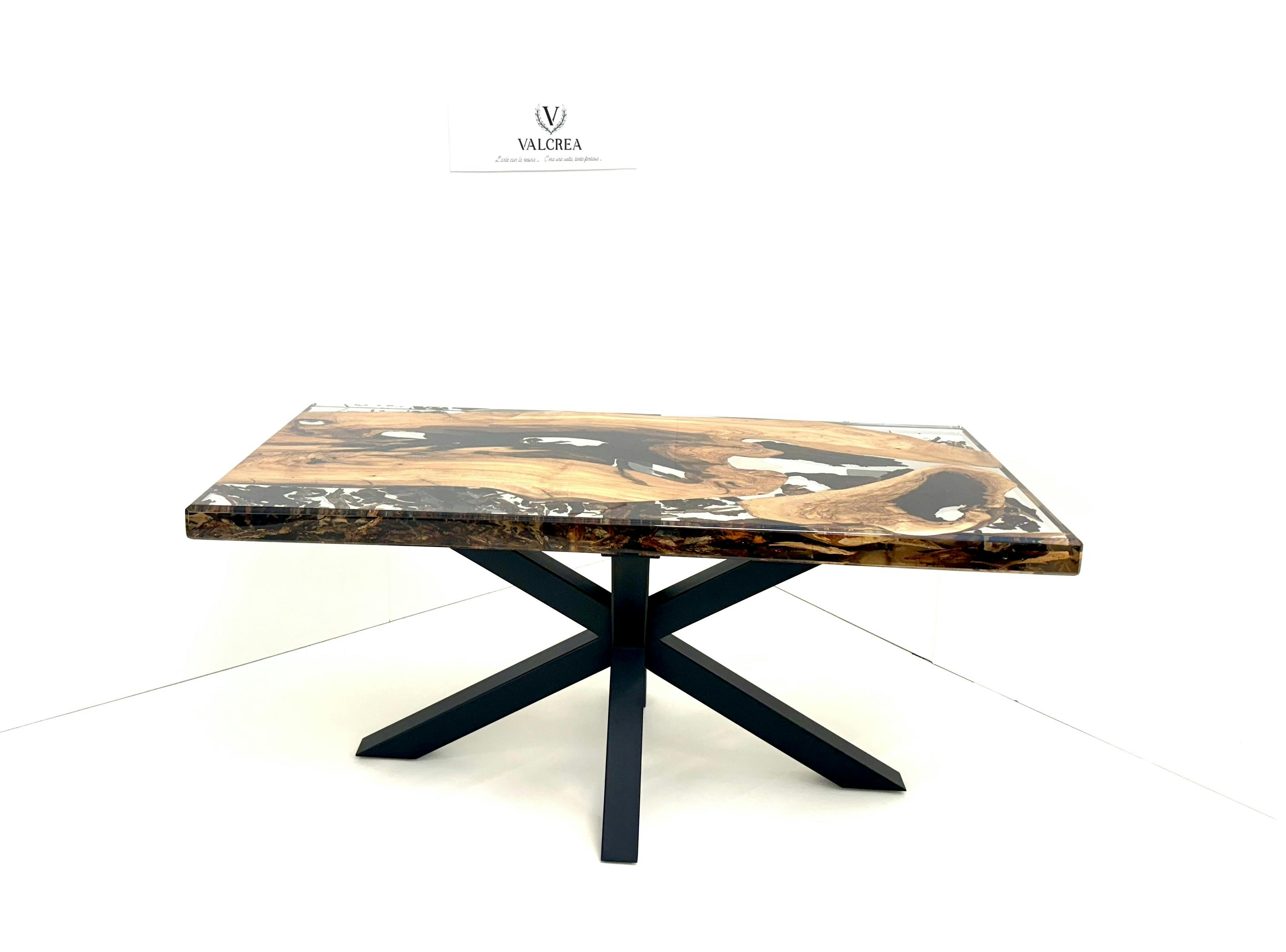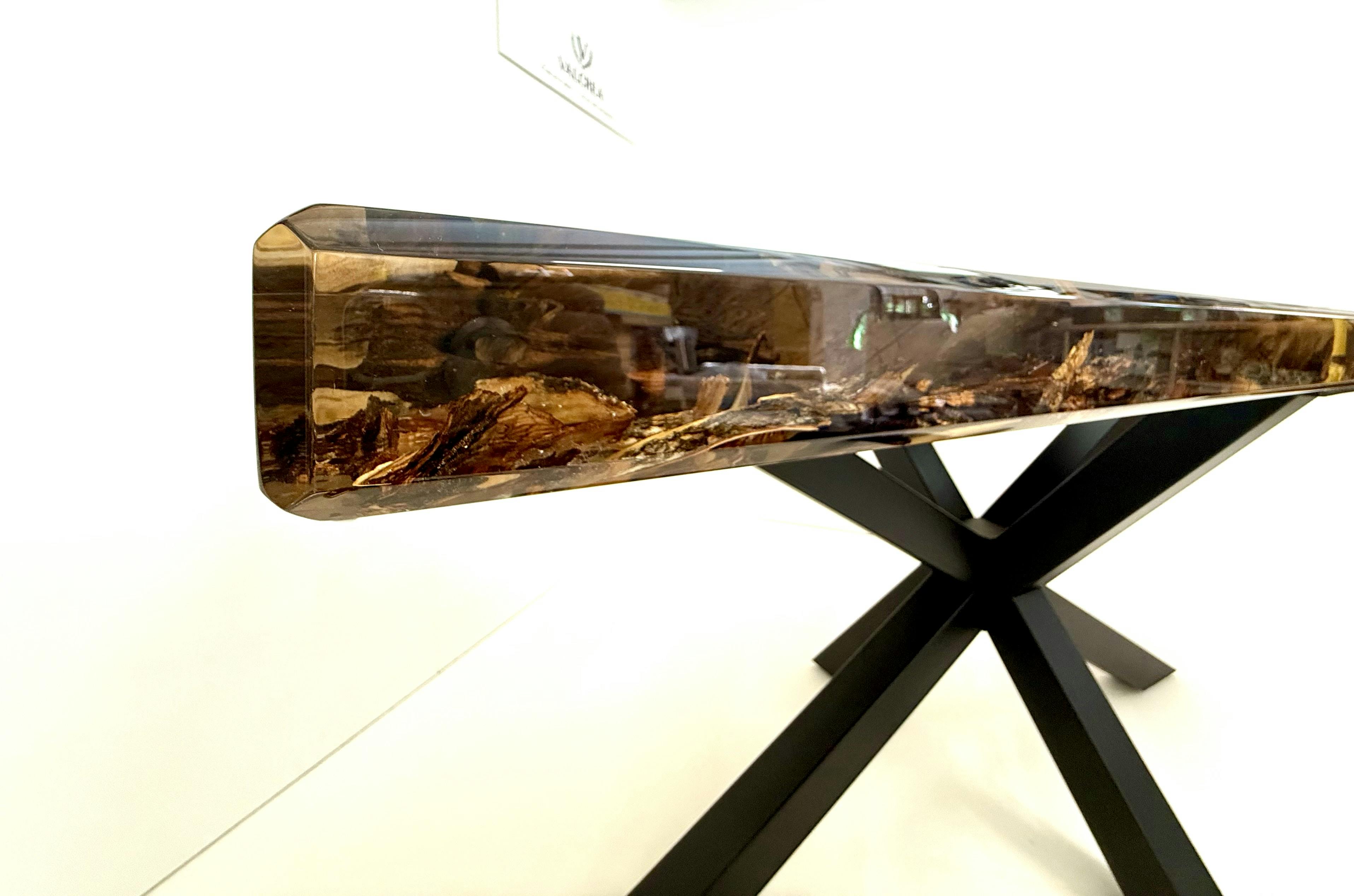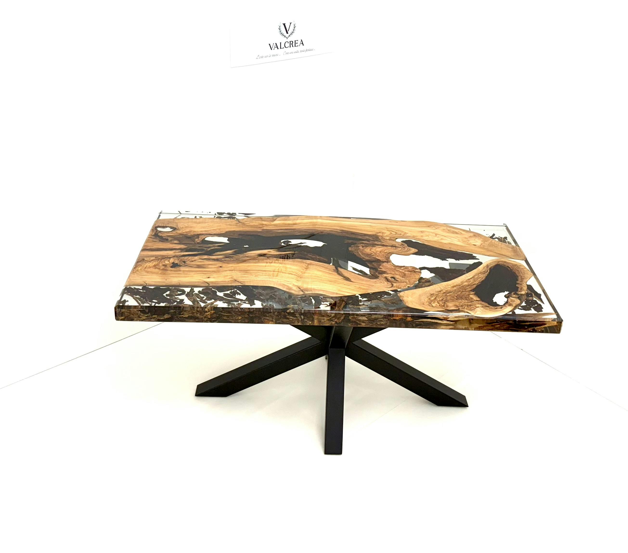 Tavolo con ulivo Salentino, design creato con corteccia della tavola, resina trasparente.
