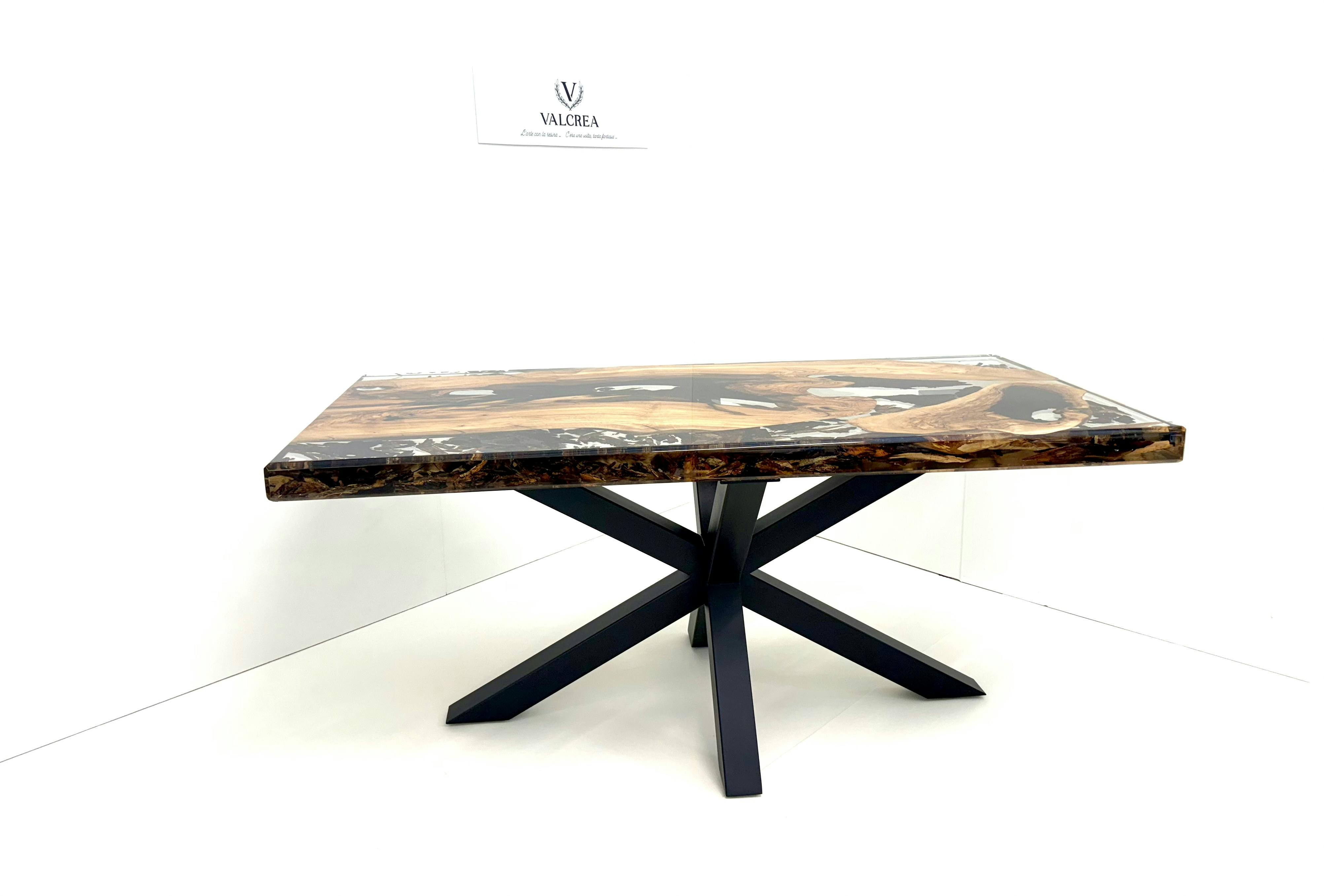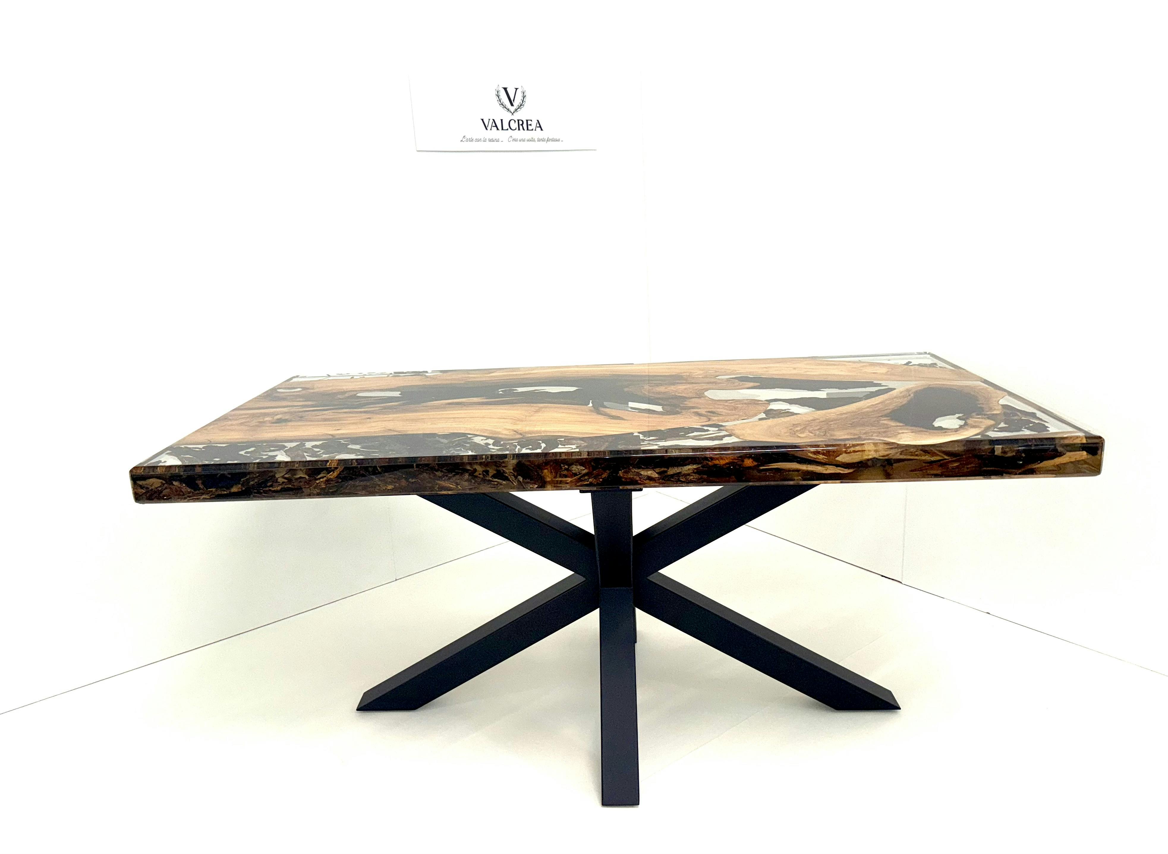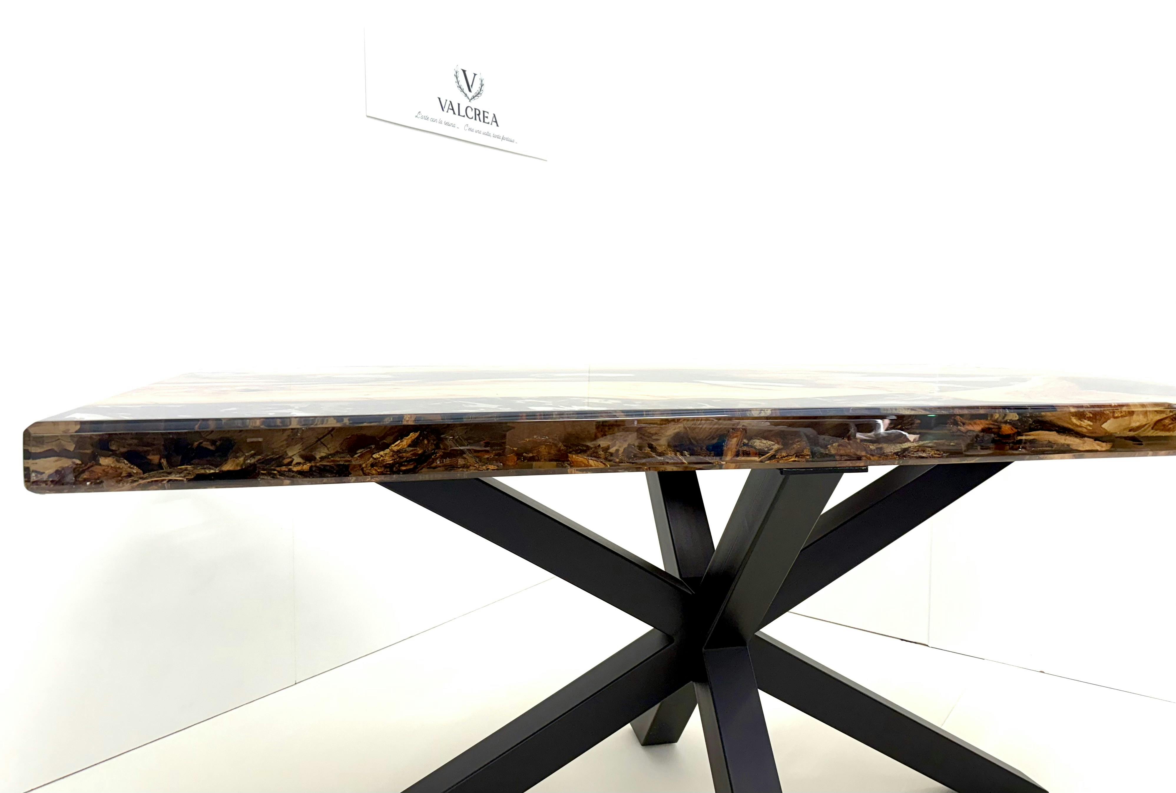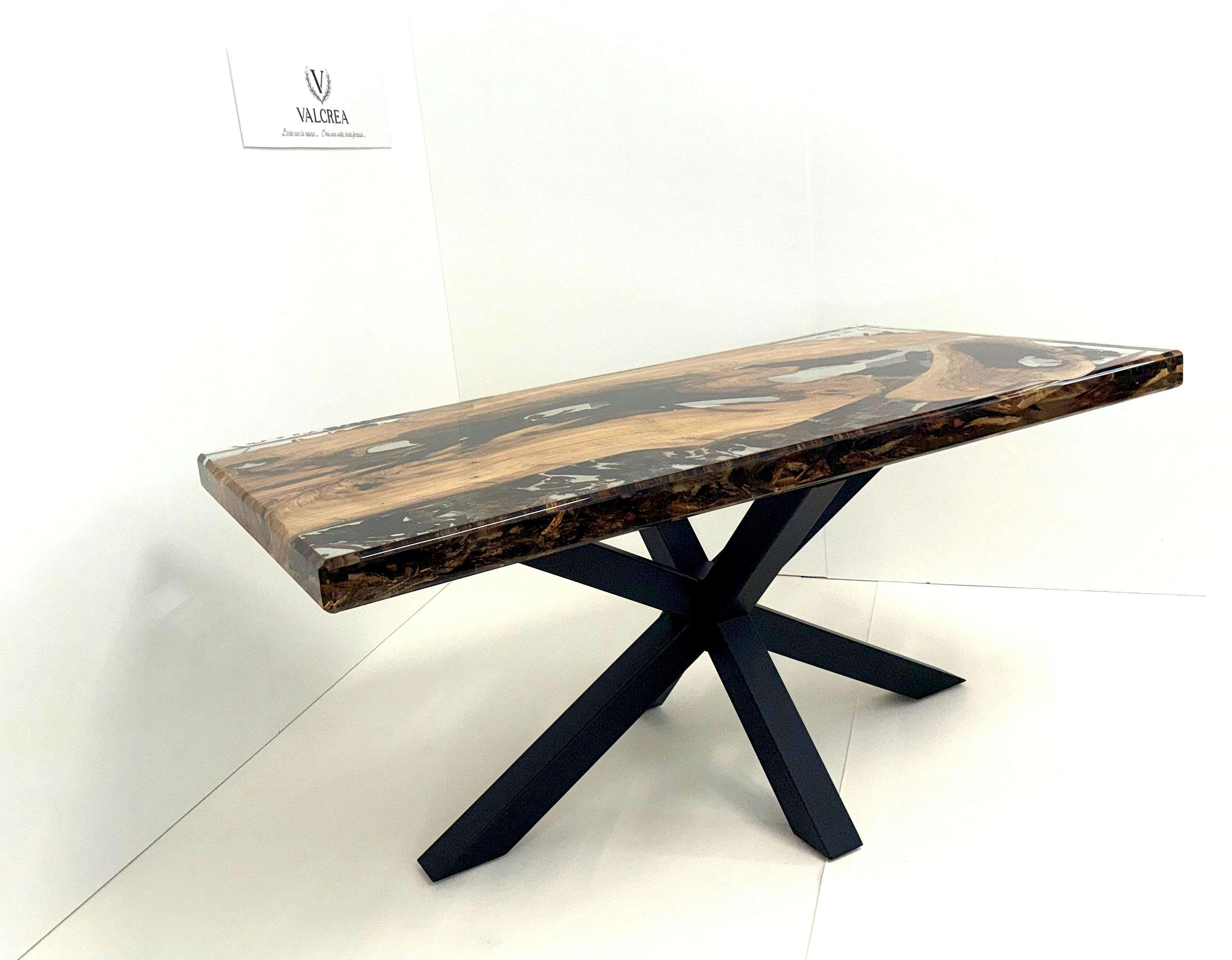 Tavolo con ulivo Salentino, design creato con corteccia della tavola, resina trasparente.