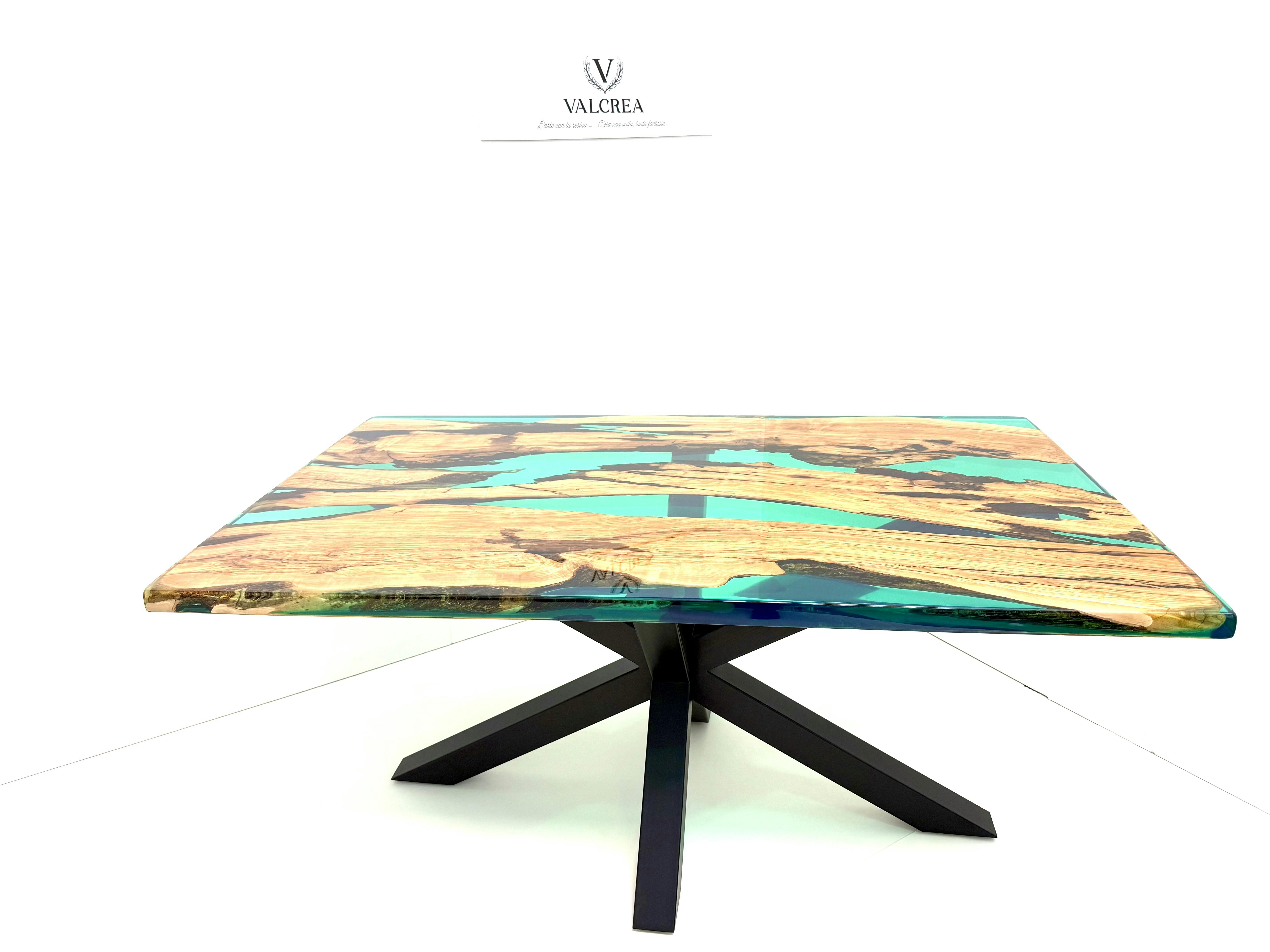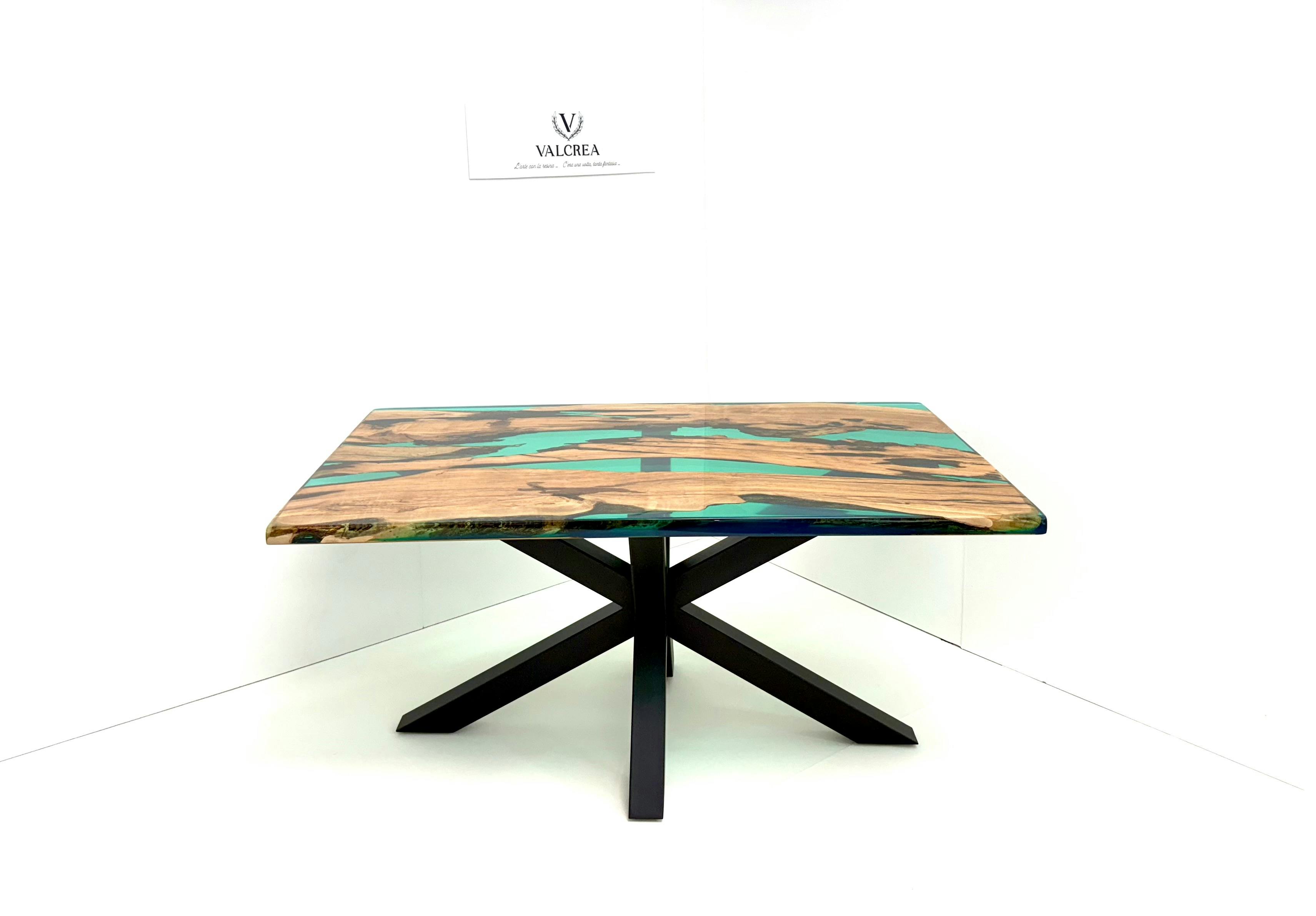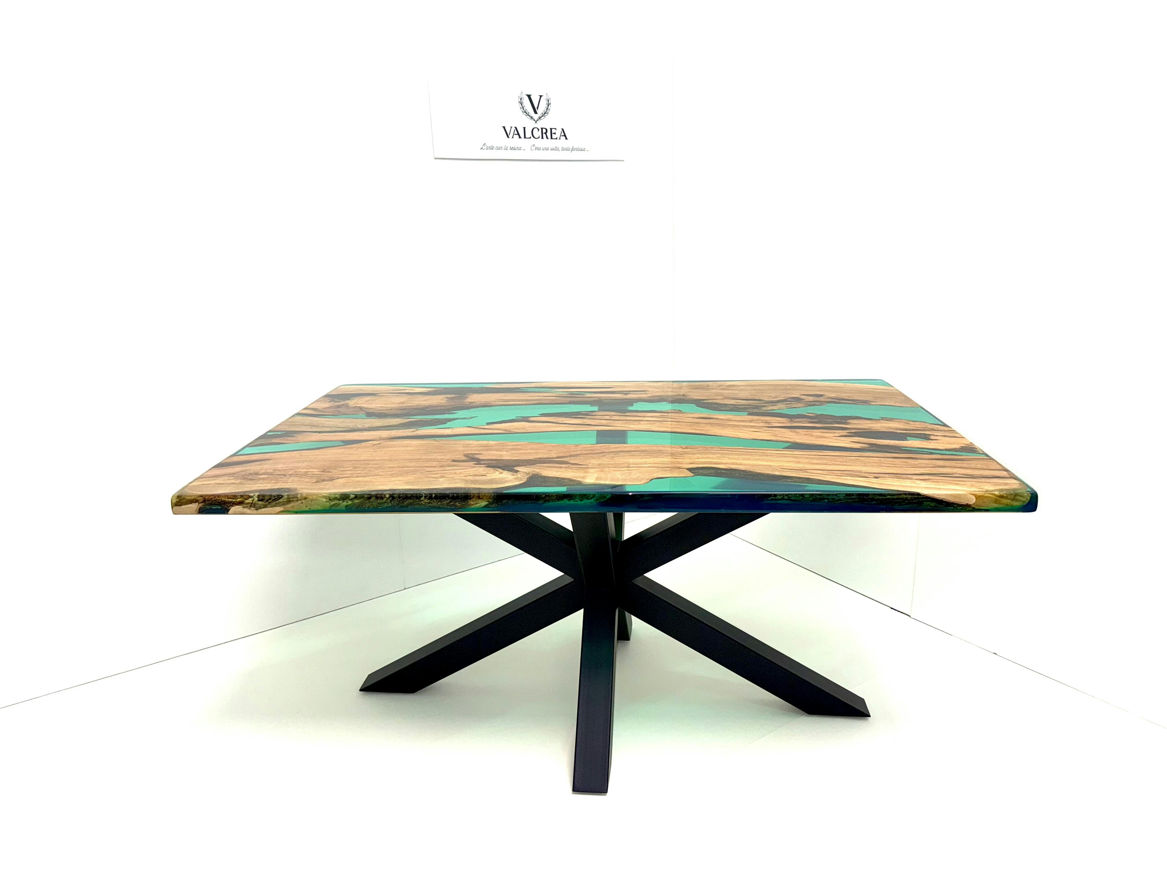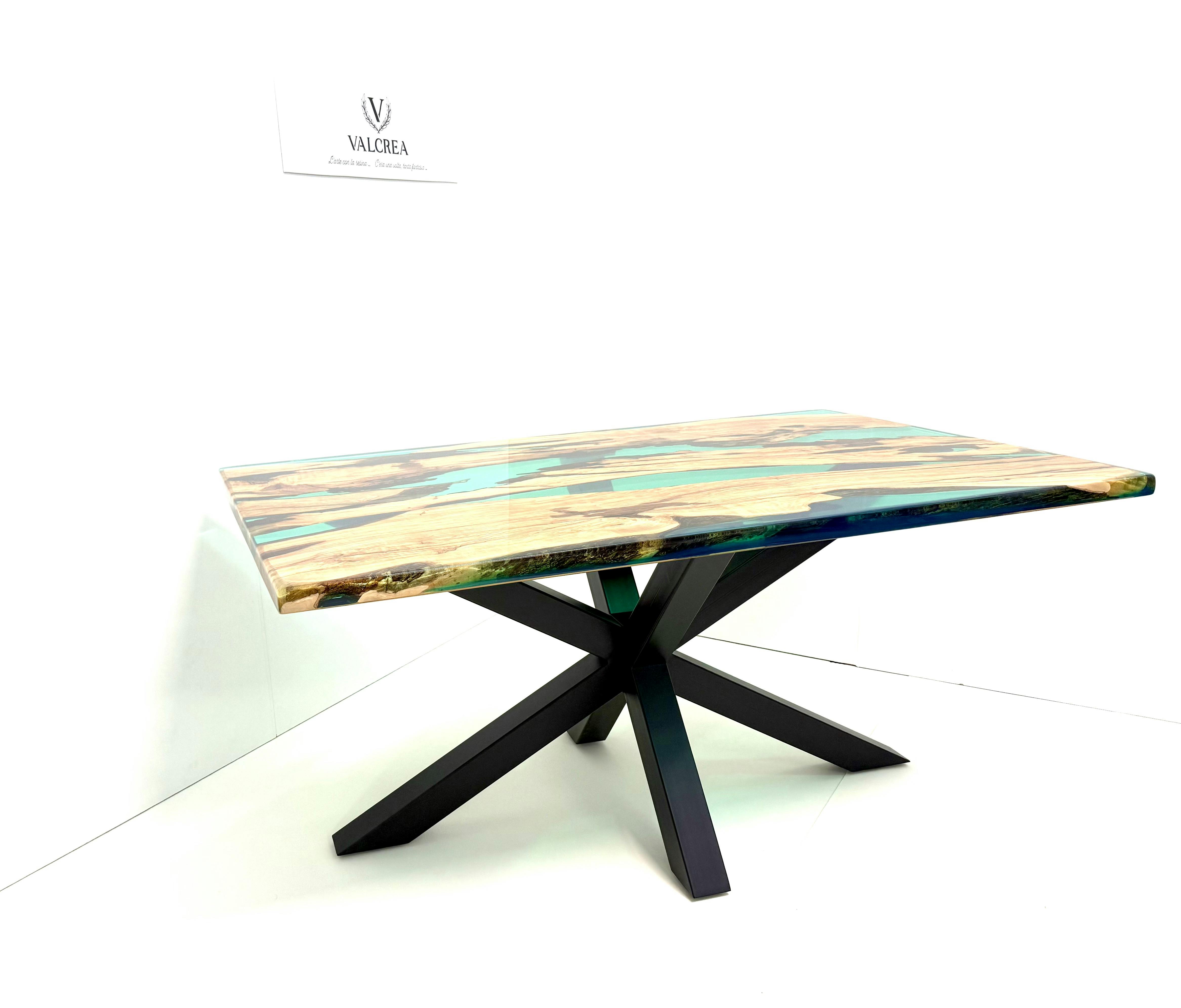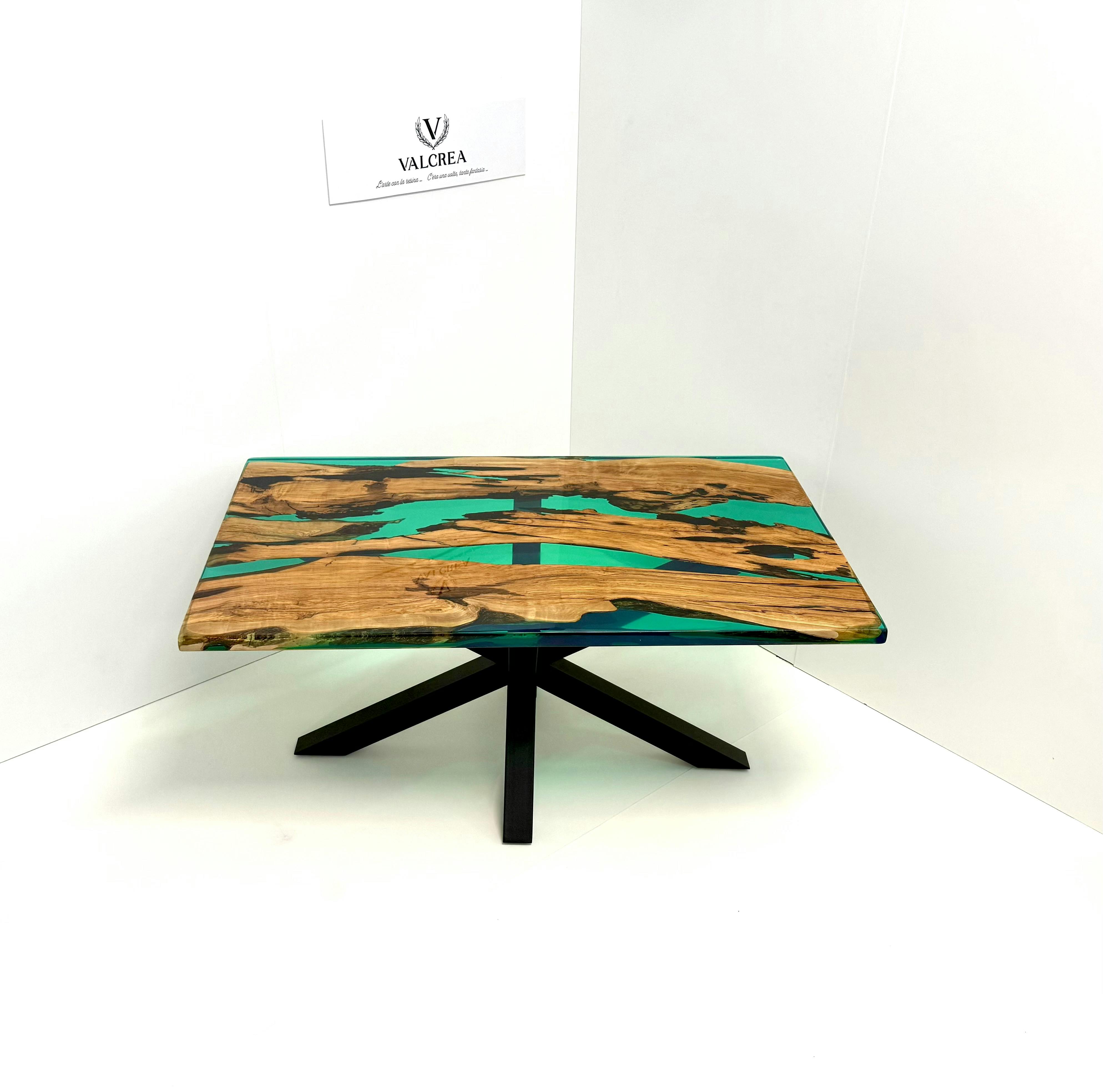 Tavolo con ulivo Salentino, colore verde smeraldo.
