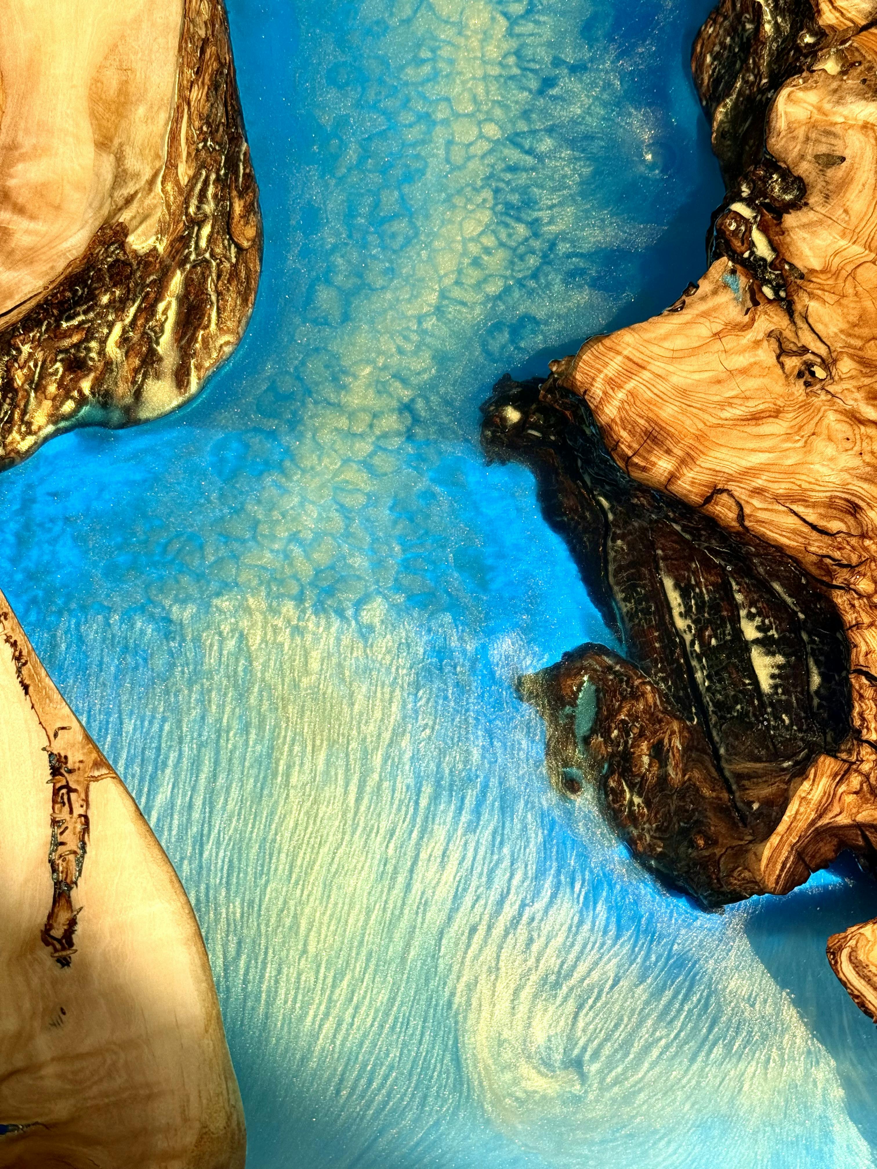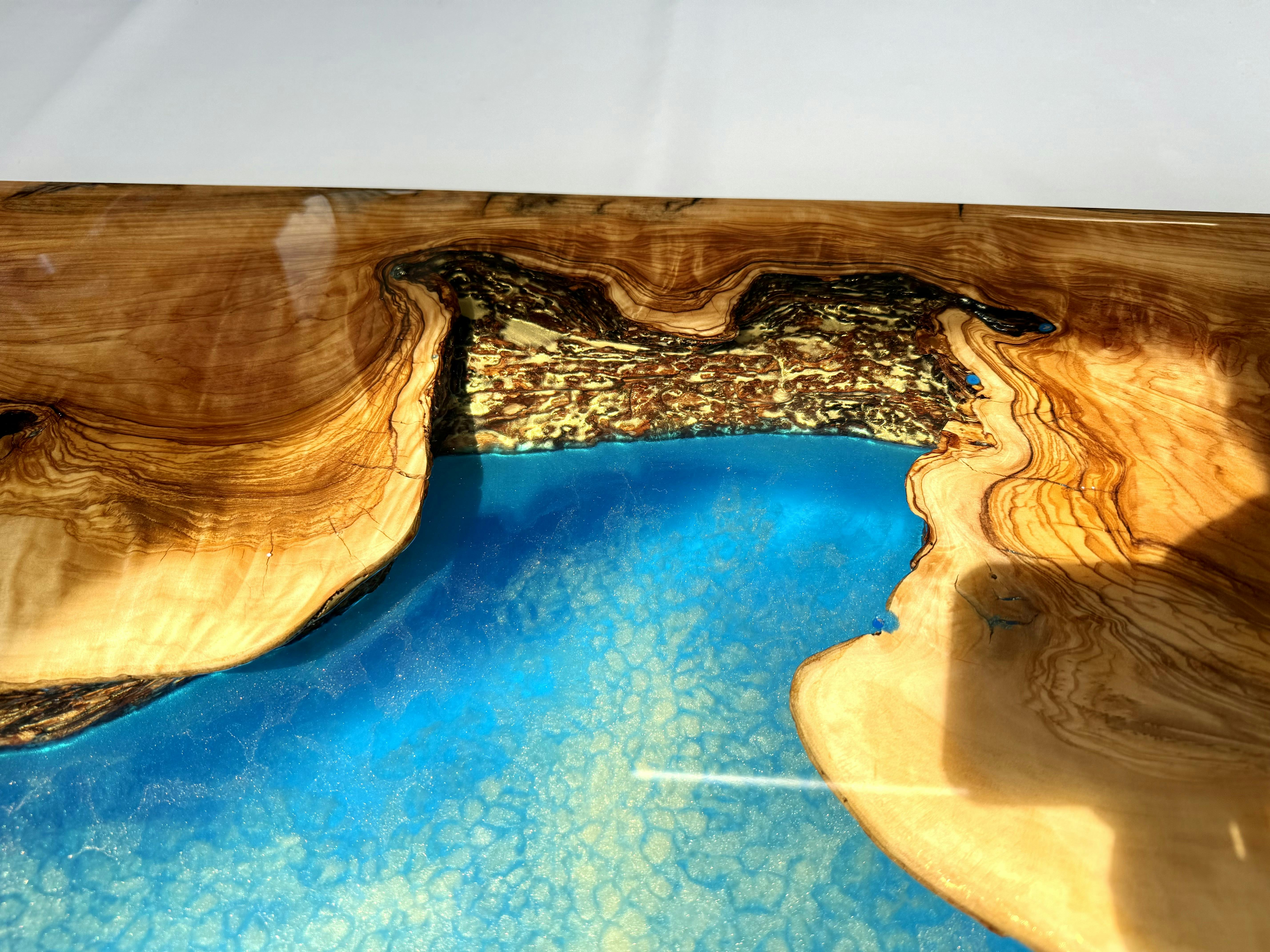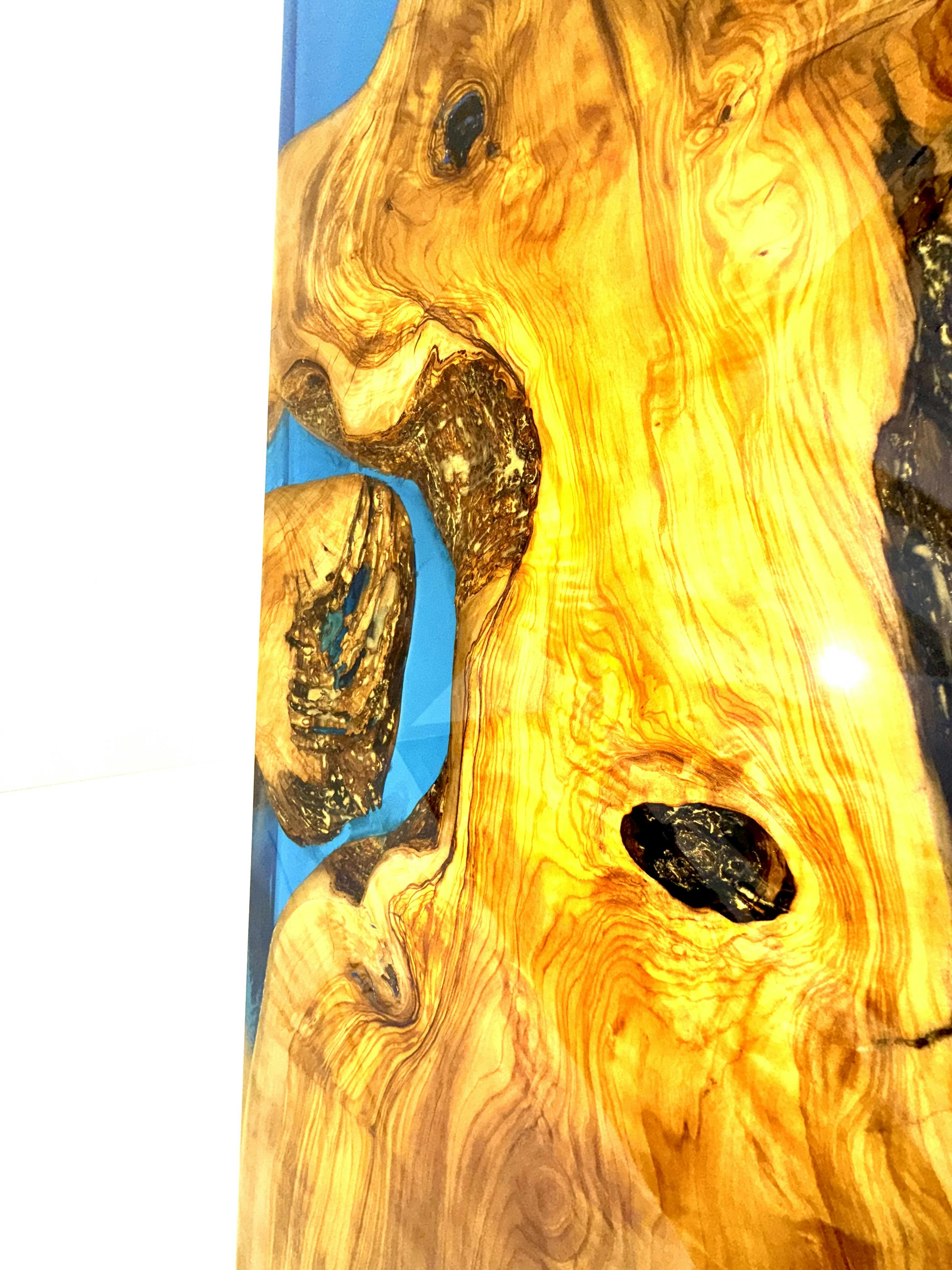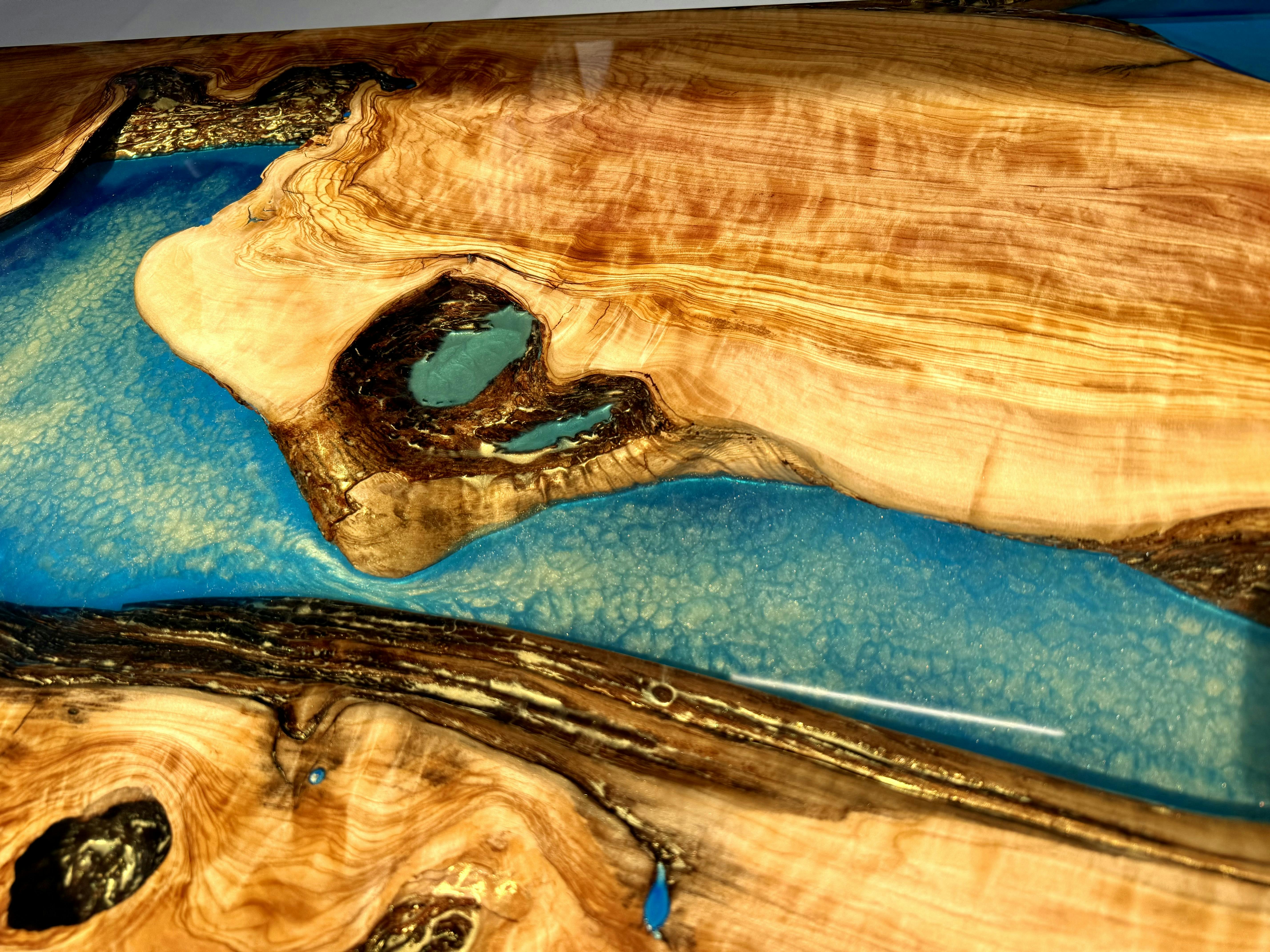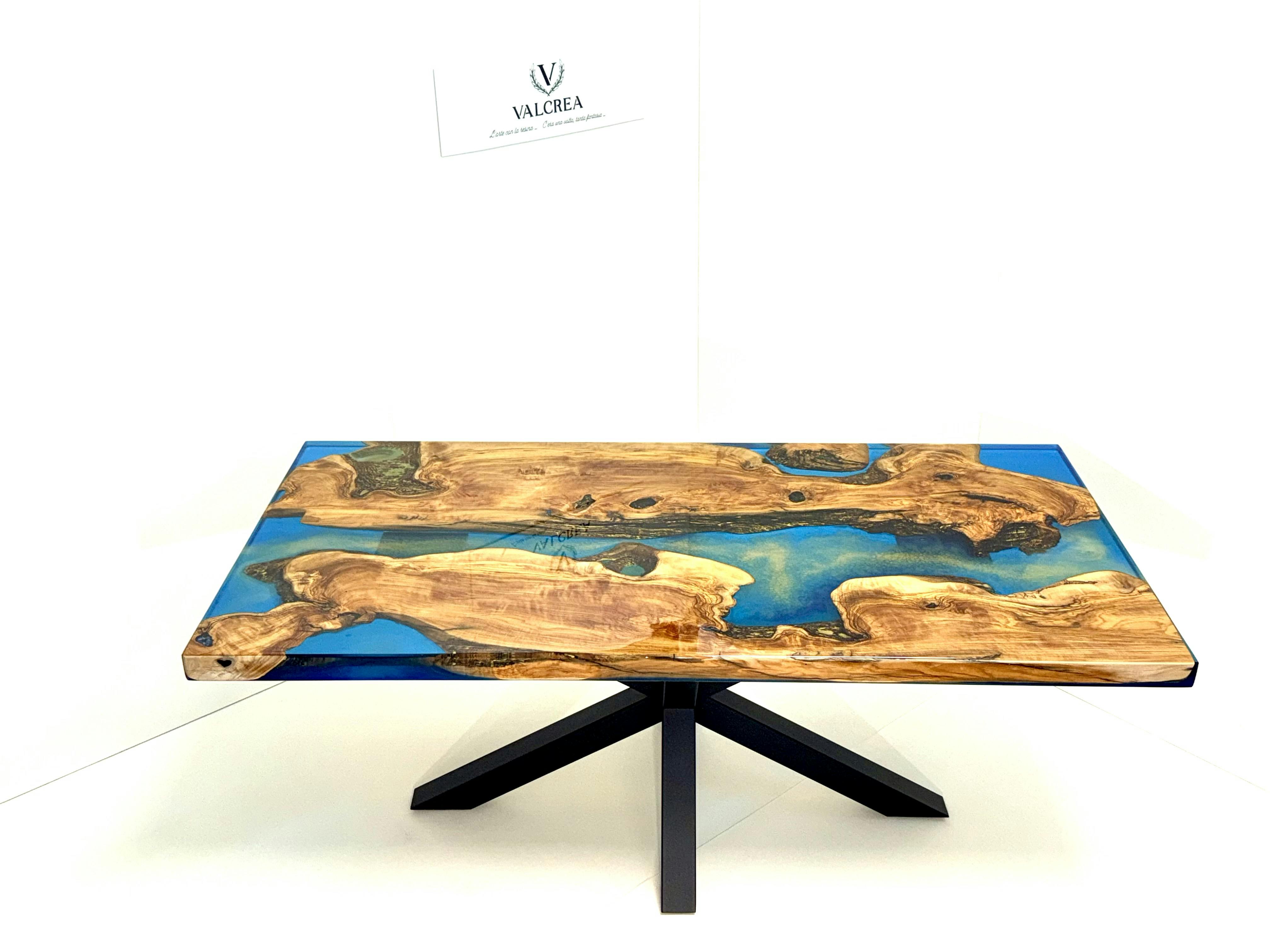 Tavolo con ulivo Salentino, design "effetto fiume", pigmento pearlascente blu e oro.