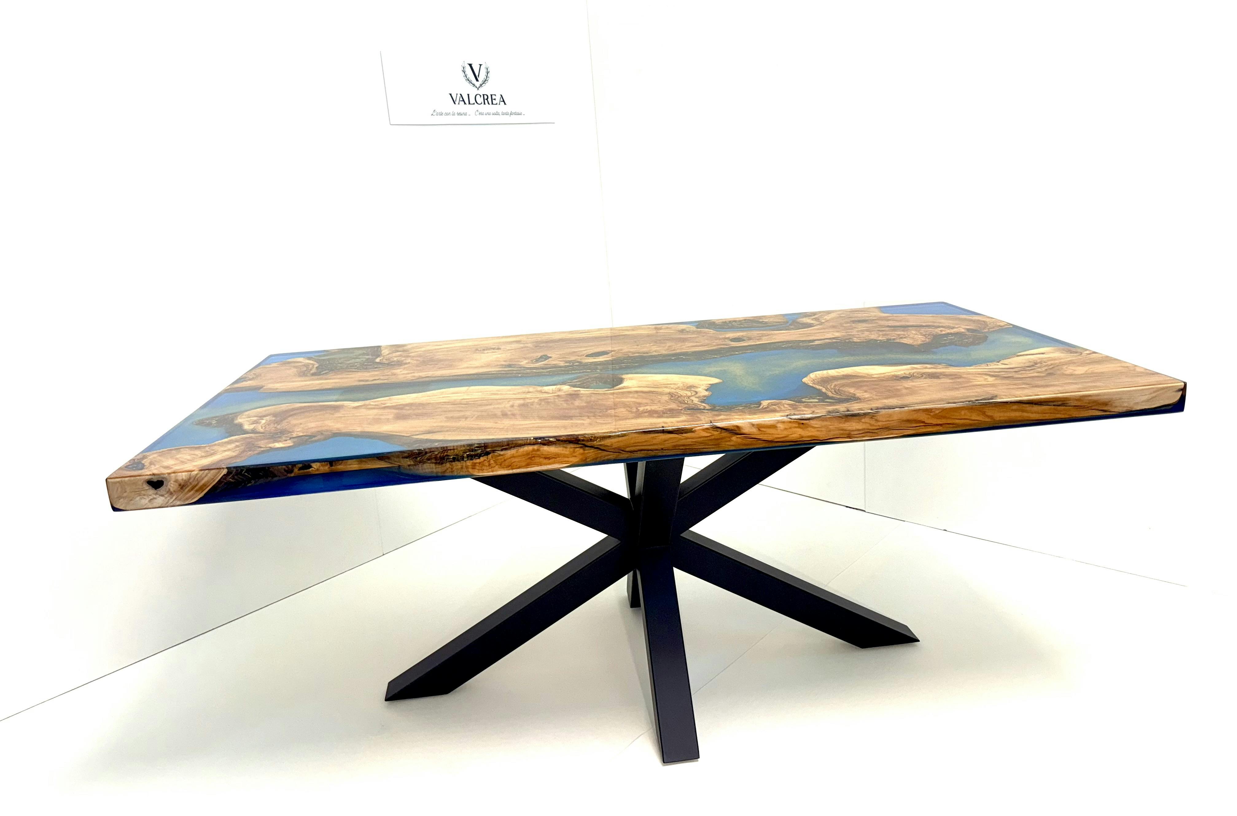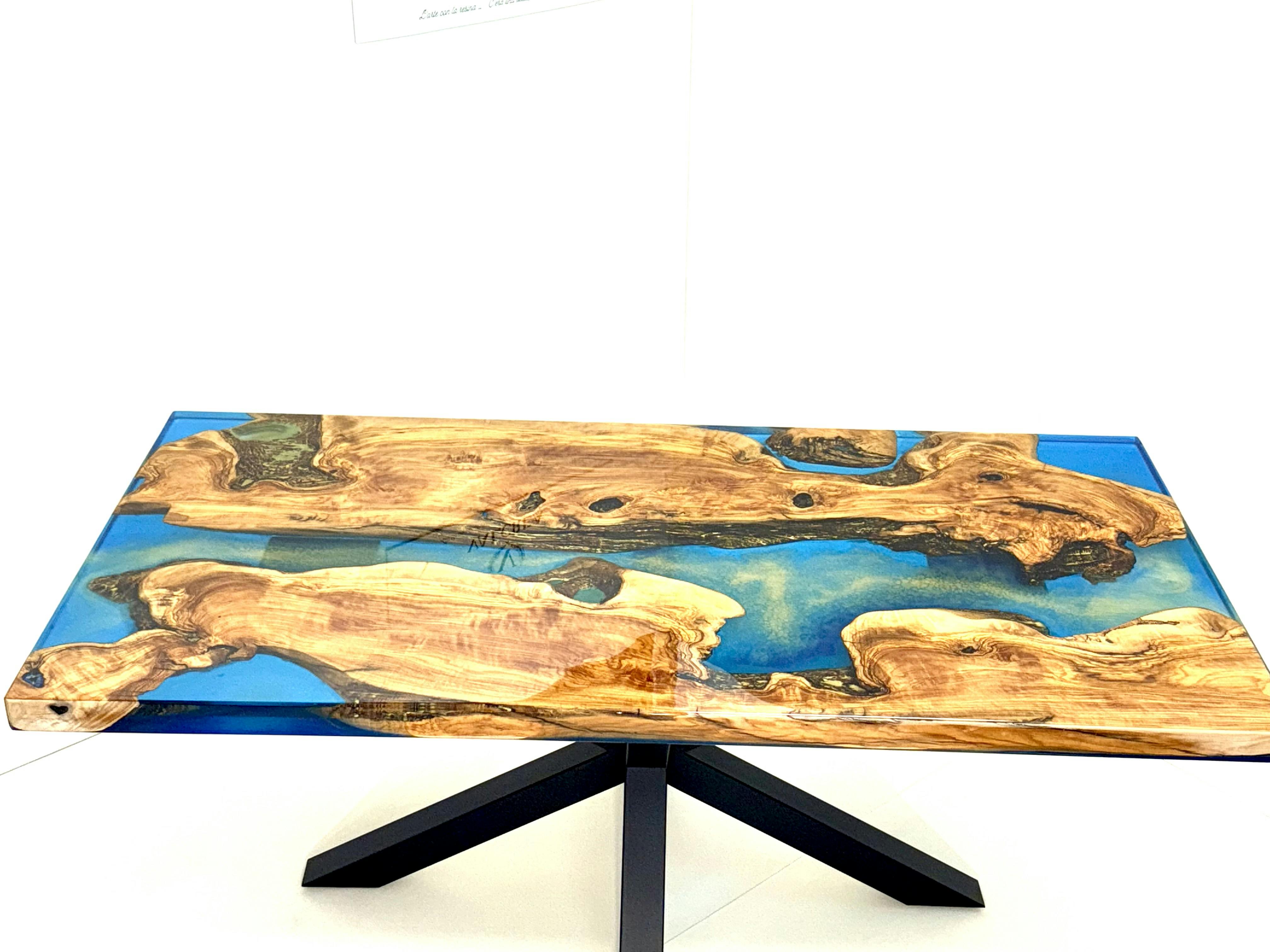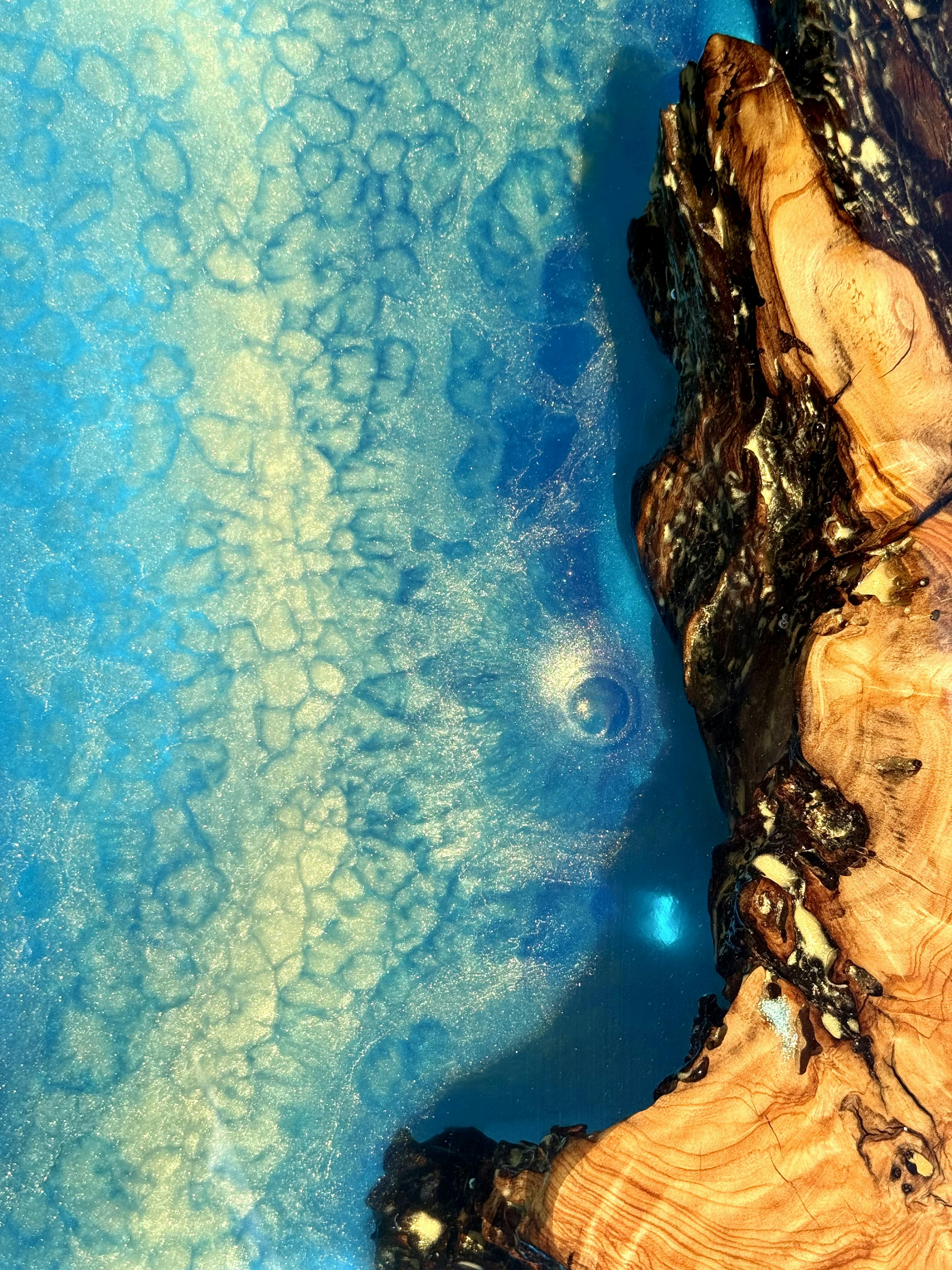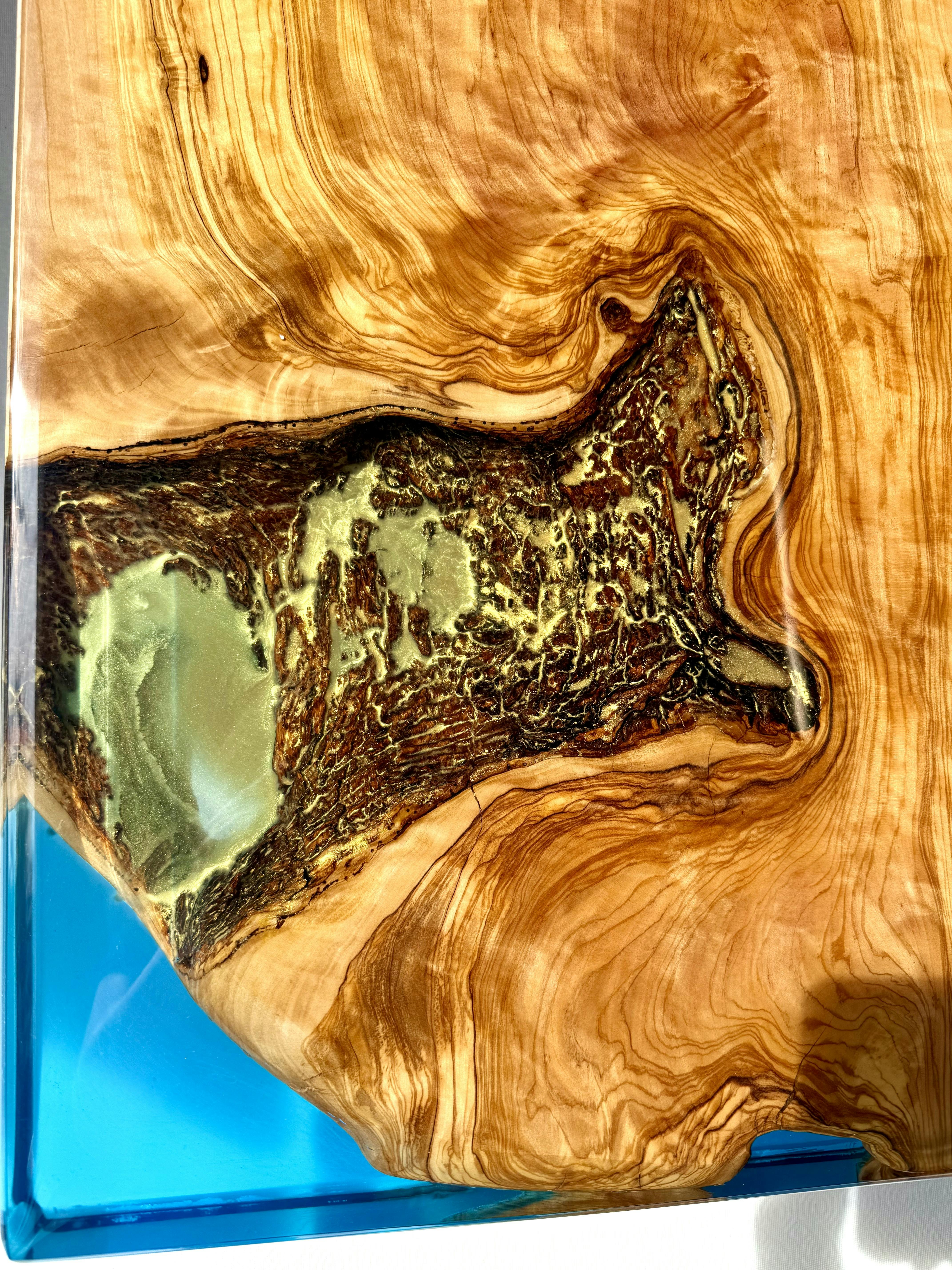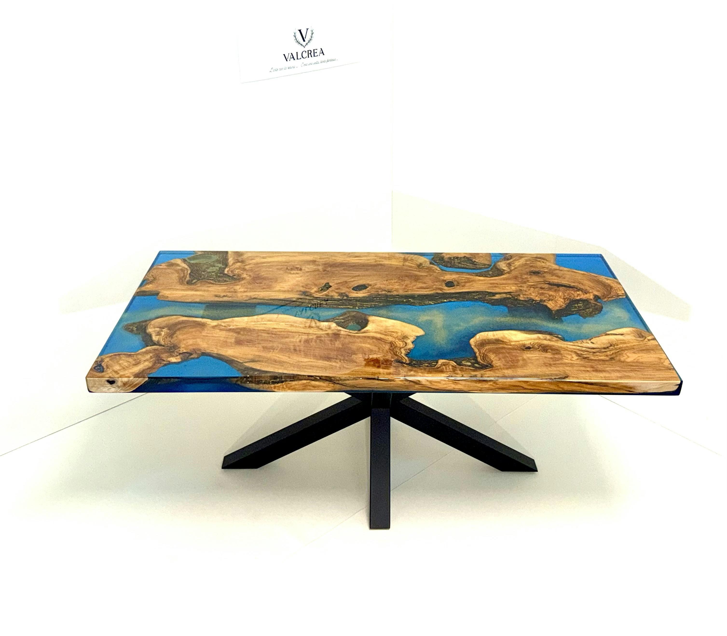 Tavolo con ulivo Salentino, design "effetto fiume", pigmento pearlascente blu e oro.