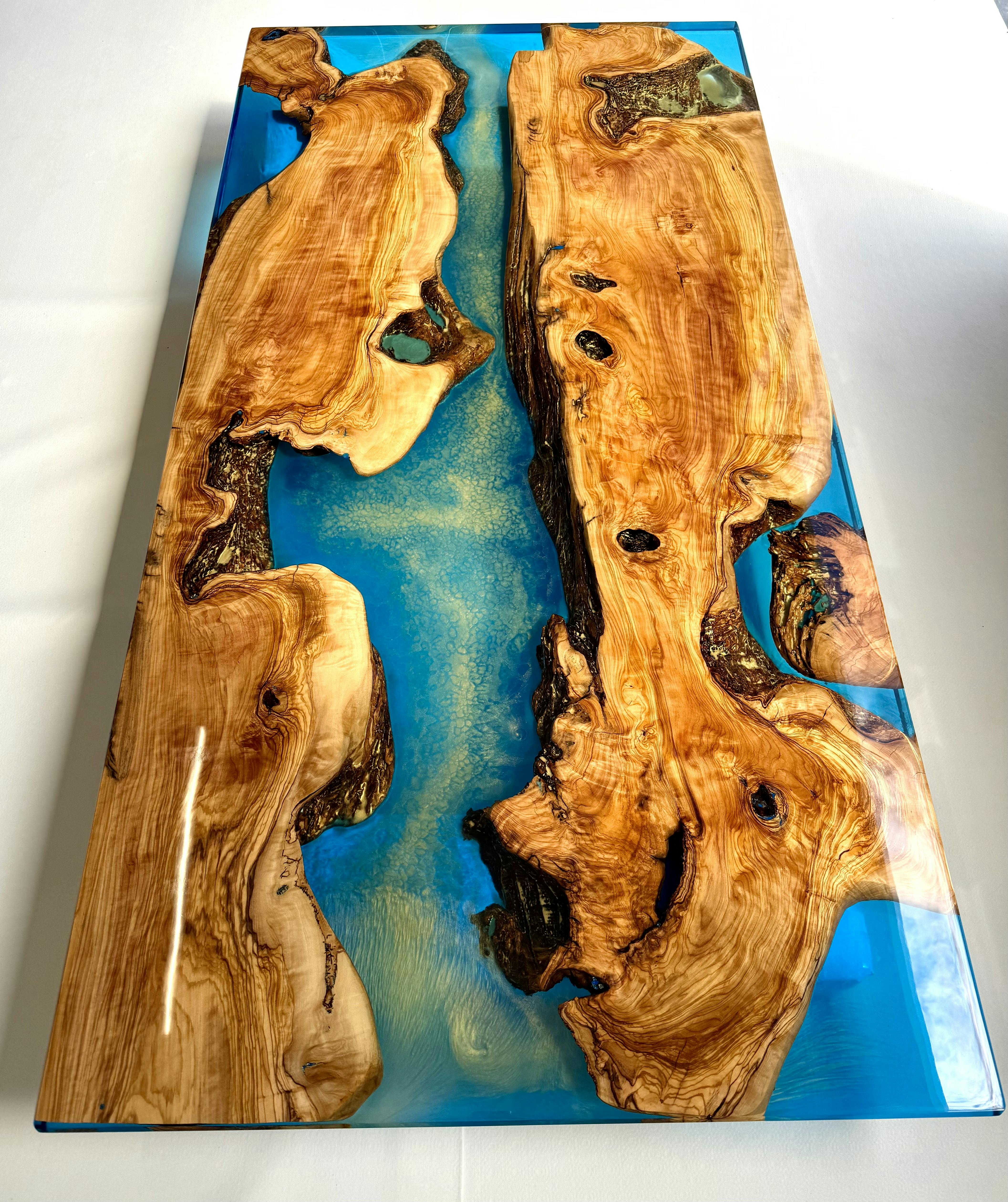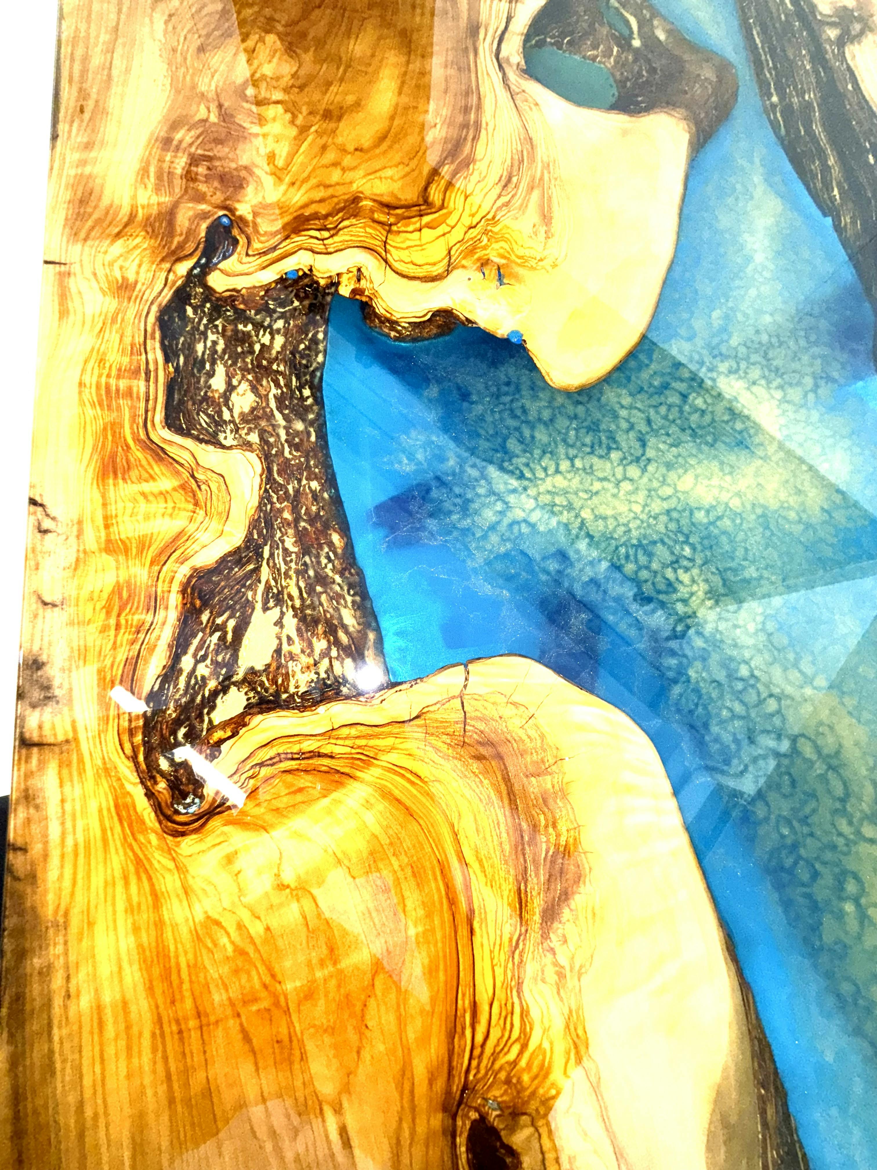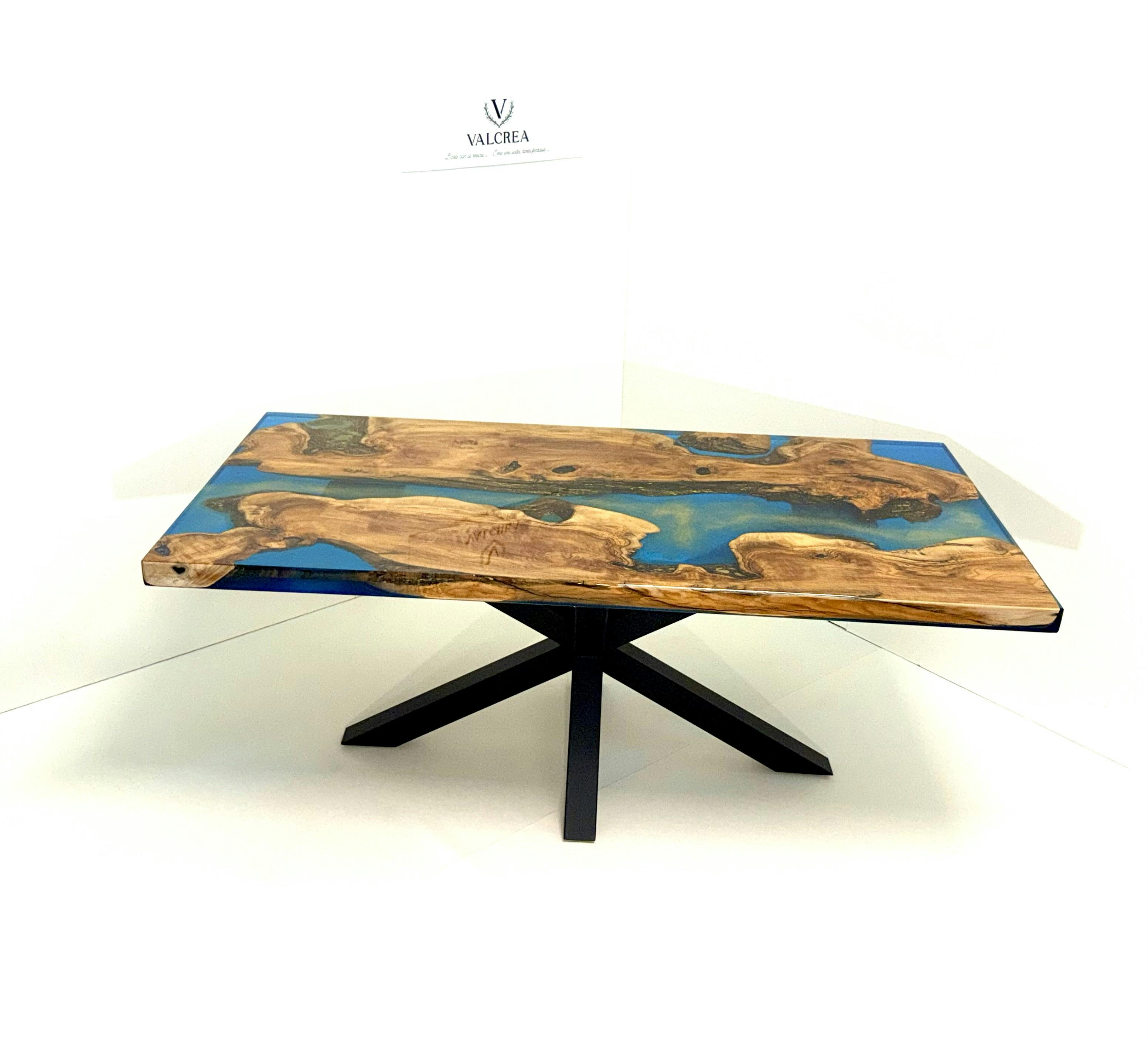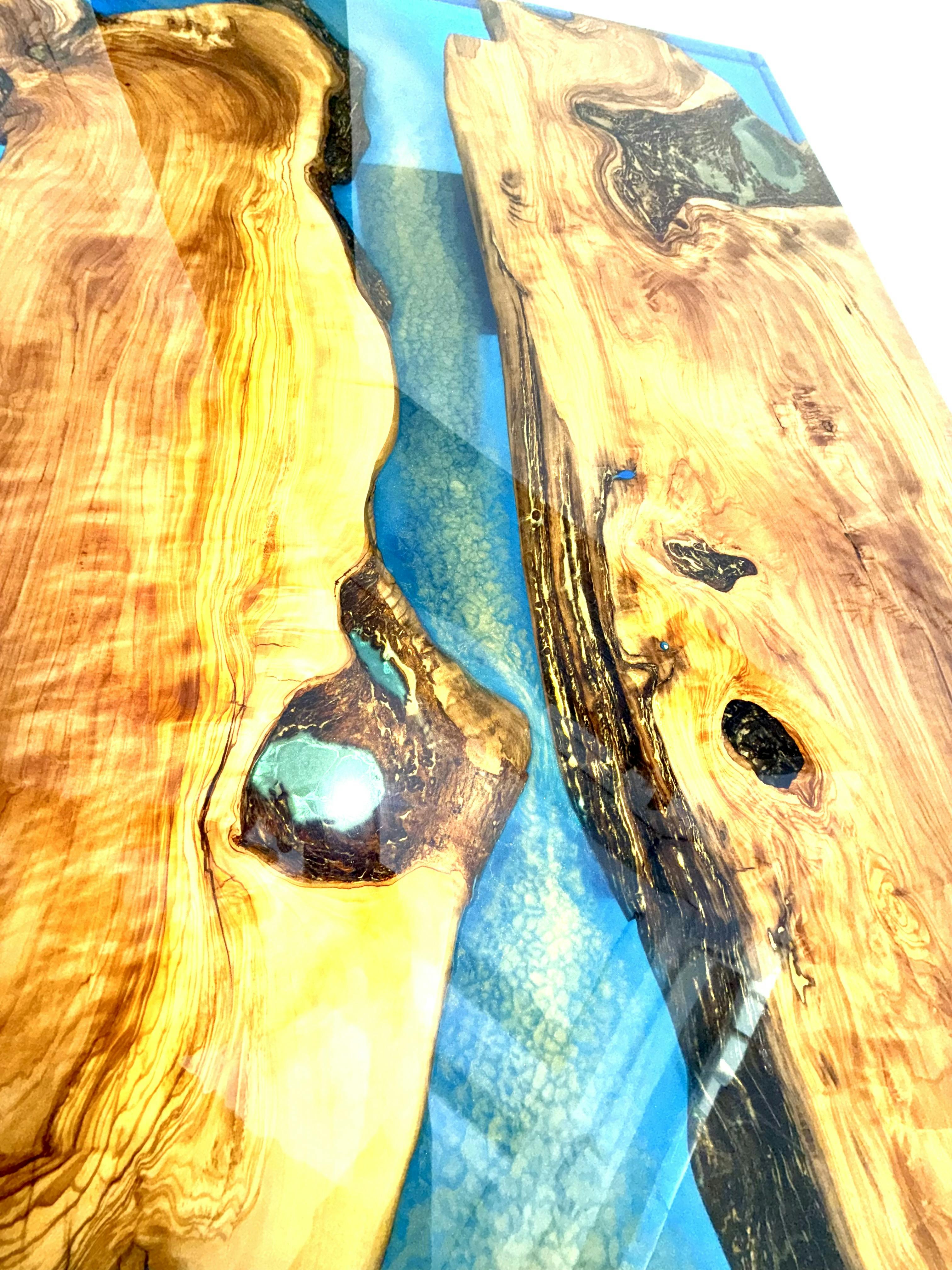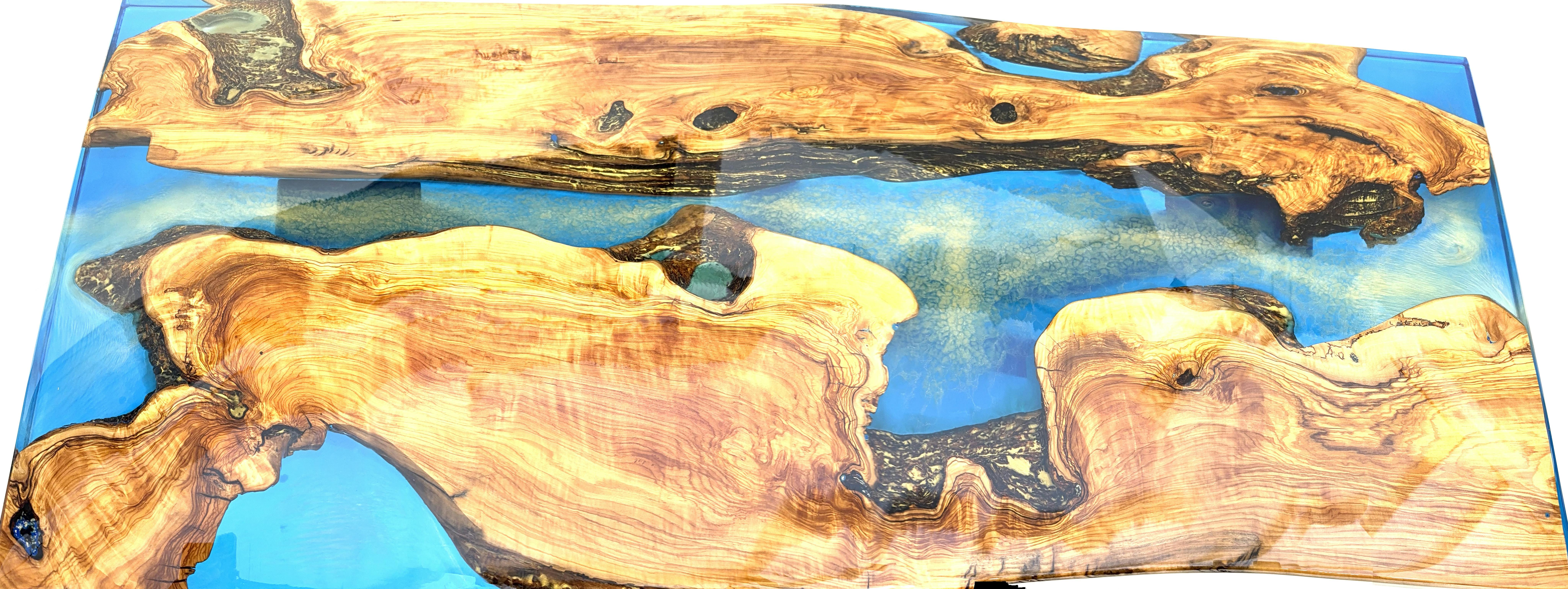Tavolo con ulivo Salentino, design "effetto fiume", pigmento pearlascente blu e oro.