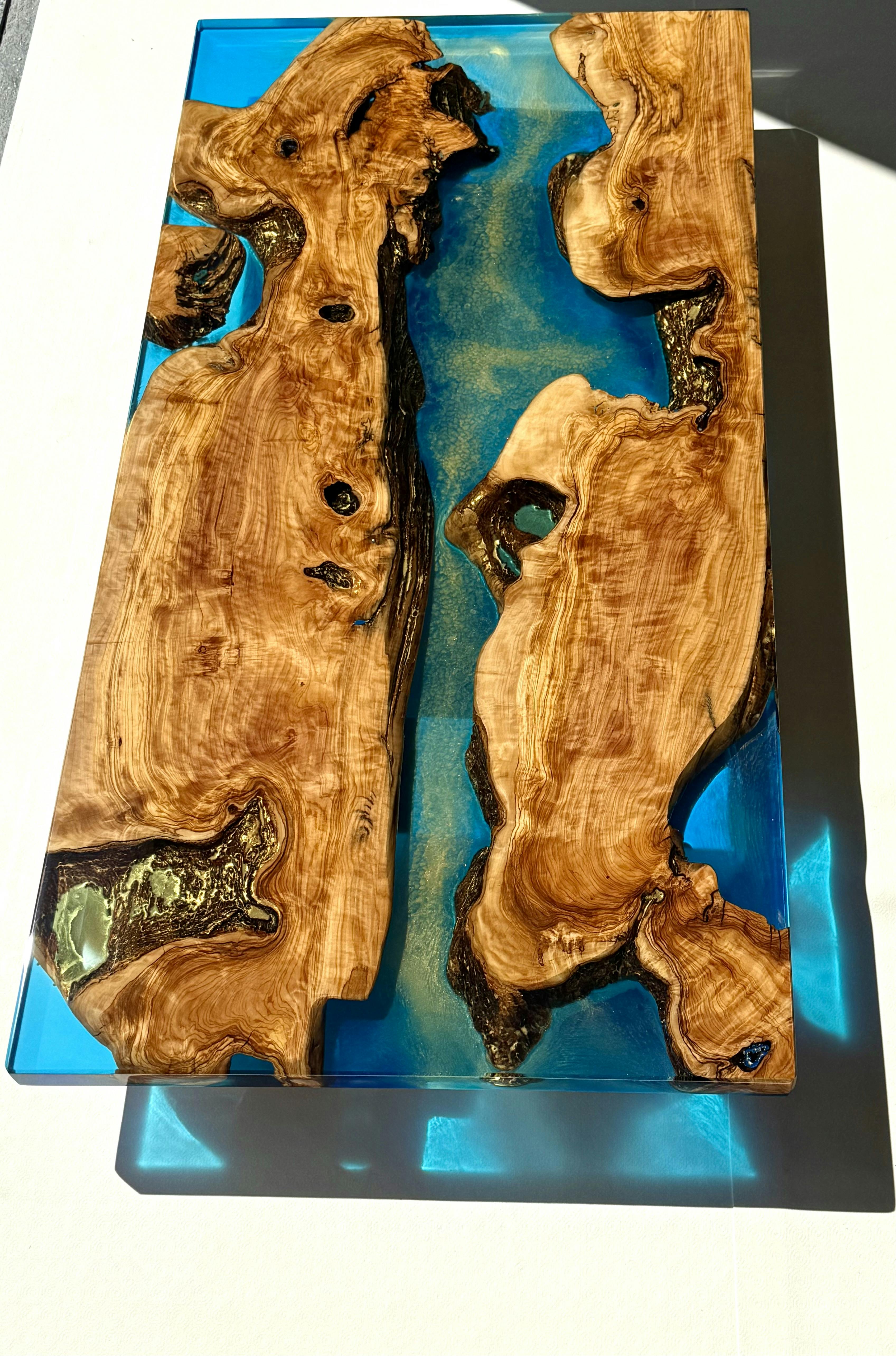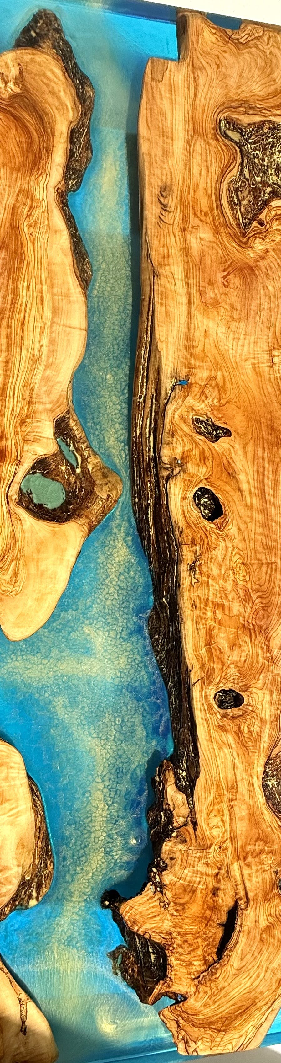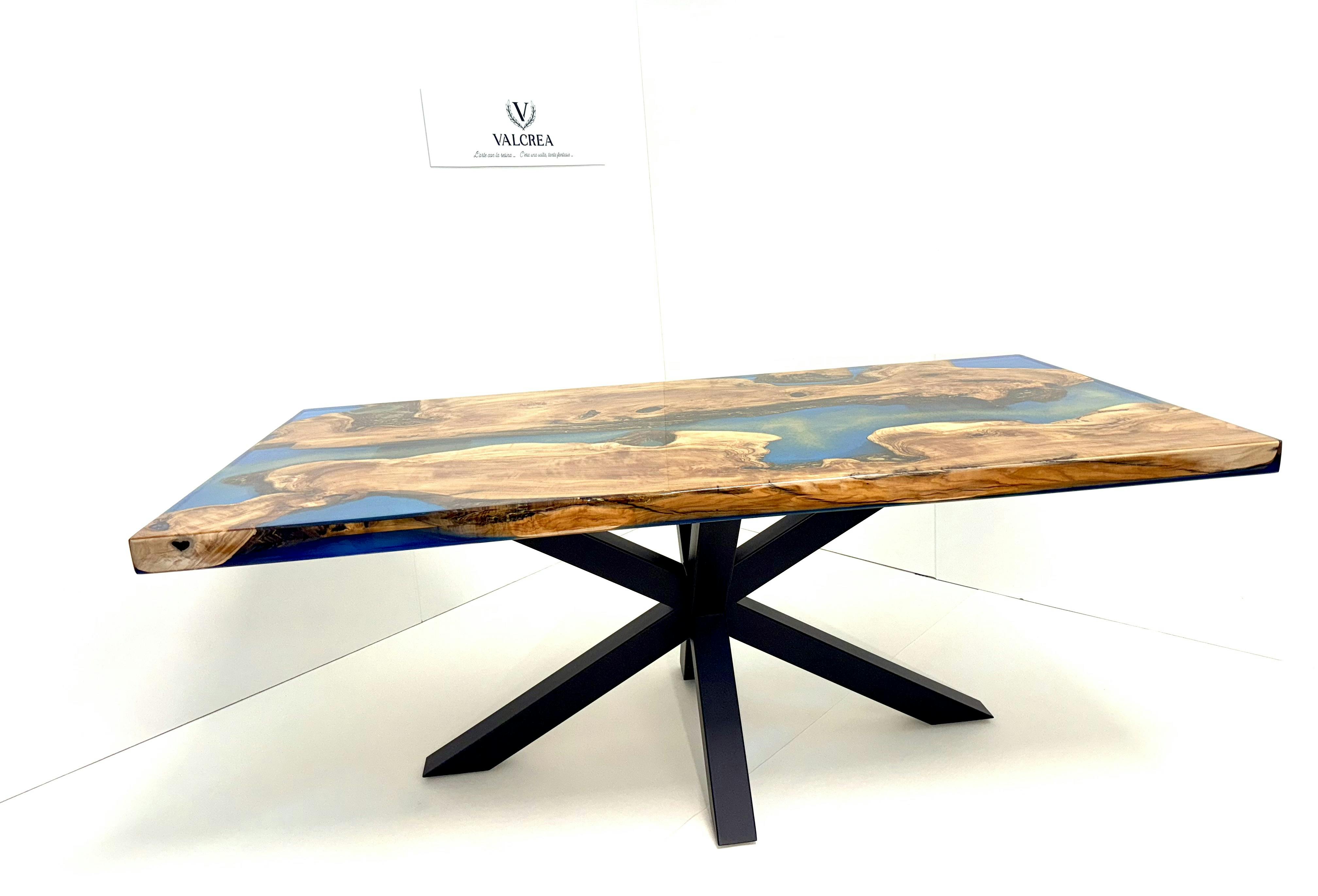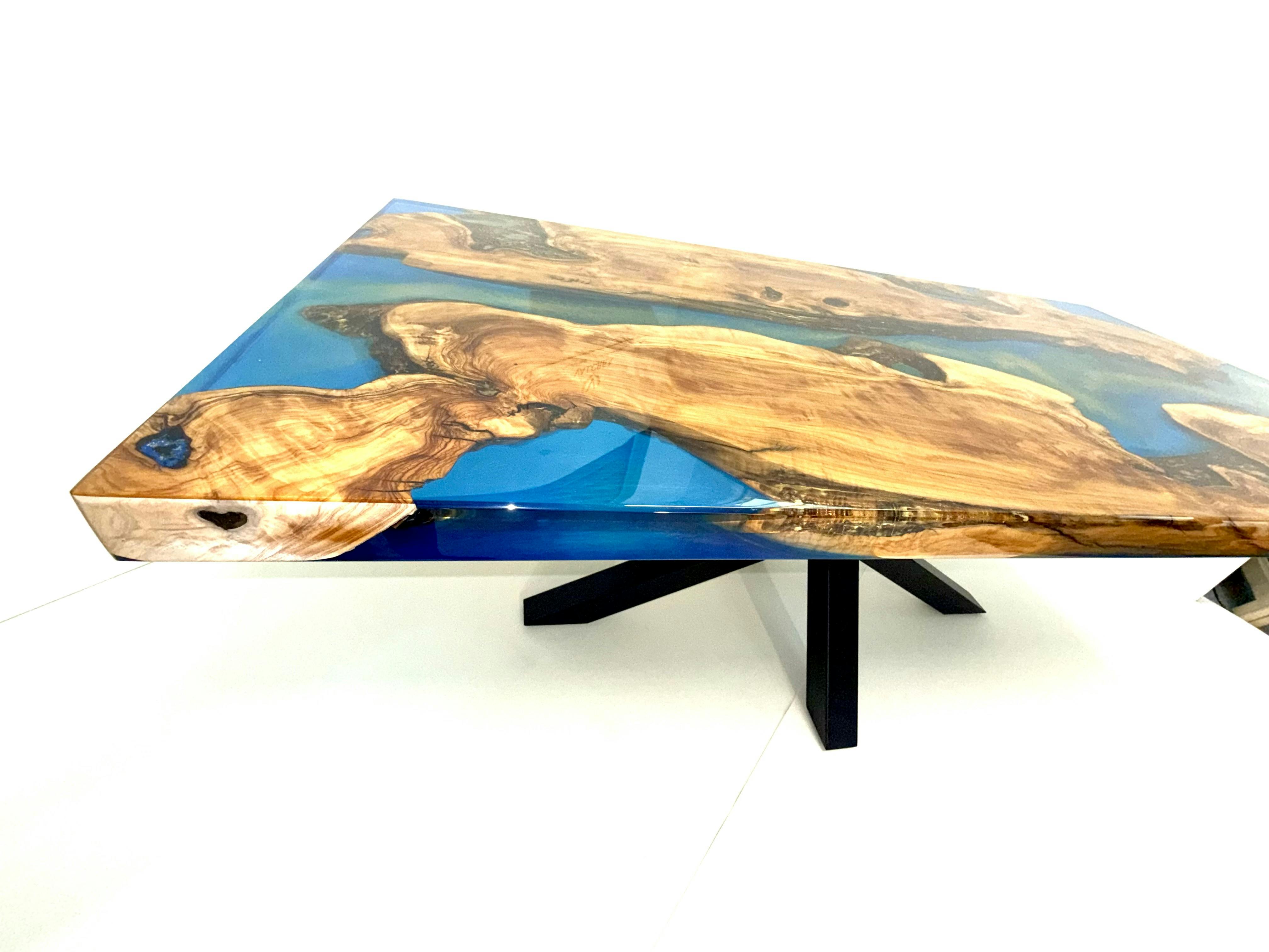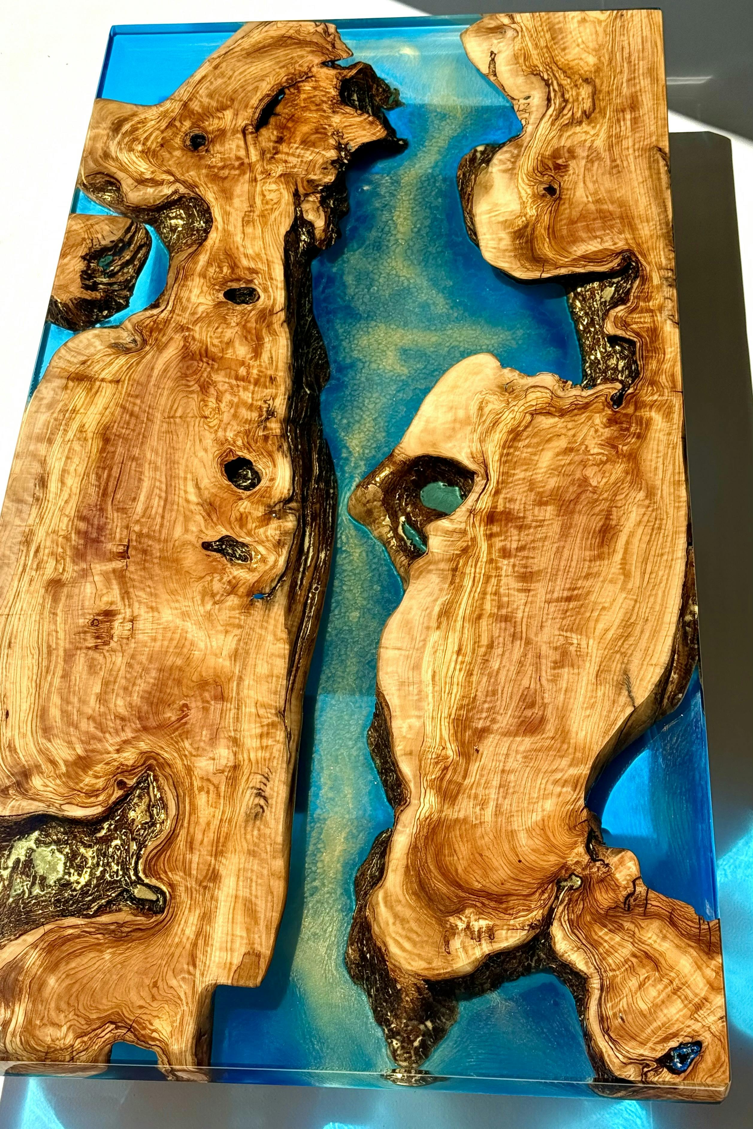 Tavolo con ulivo Salentino, design "effetto fiume", pigmento pearlascente blu e oro.